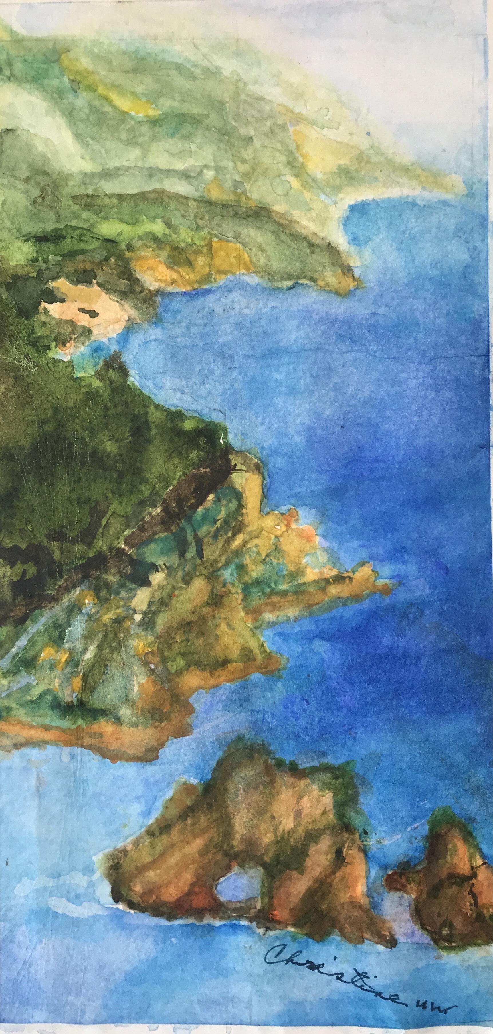 I’ve been painting and talking since I was three! As the first grand-daughter and a 2nd generation American, I grew up in a large and creative Polish family who encouraged me as they restored a 100 year old house themselves. I watched my Mom paint, sew, sculpt, crochet and bake; my father studied journalism/writing (suddenly interrupted), transmitted messages for Western Union, became a tool and die maker and used his hands for creative projects at home.” Highway 101” began as an inspiration from the work of another artist. It was a challenge because I have never painted a seascape! Looking at photographs gave me more information and introduced me to the idea of adding color into the cliffs. I began noticing the variety of warm and cool colors in the earth tones. I am also experimenting with atmospheric perspective. I was drawn to this scene by a memory of stopping with my parents on the Highway near the Hearst Castle.