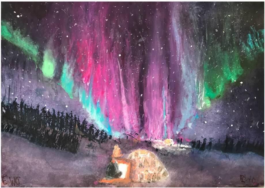 I received a postcard from a friend who visited the Aurora Borealis. I was so impressed with this vision that I had to paint it myself. I couldn’t believe that you could see such a beautiful sight in our world. The colors and my own state of being seem entirely different when you work with a nightime sky.