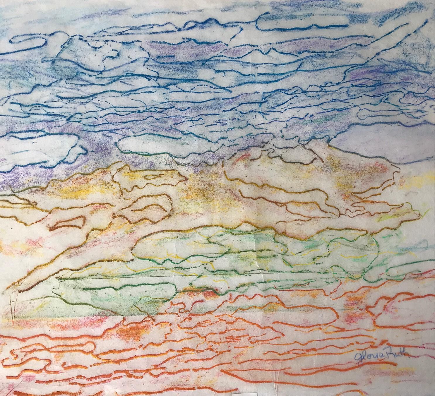 The rhythmical lines in “The Connected Earth” were created by ‘rubbing’ over string glued onto a board. The linear pattern was originally vertical and came from rubbing over tree bark. I reinterpreted the pattern horizontally with color: when arid dessert was nourished by the sea to develop fertile land and build the mountains, then, the sky produced rain connecting all the earth! Gloria Ruth