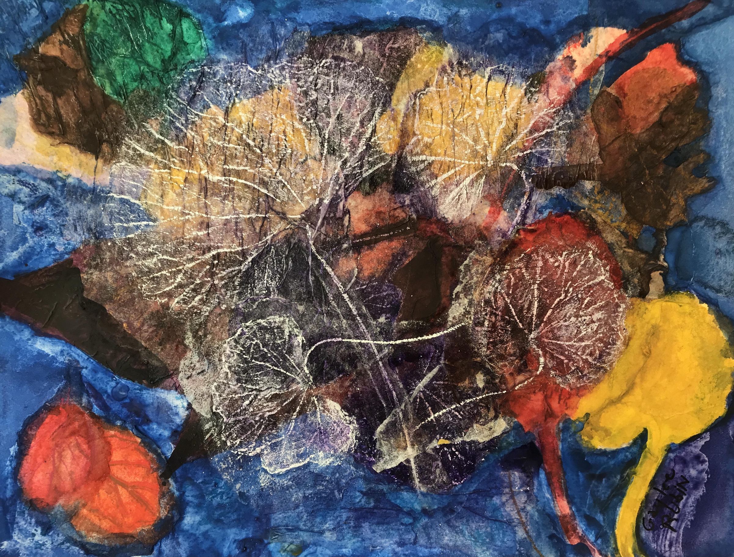 Gaylee is new to painting but not to the arts. She earned an MFA in creative writing at the University of Michigan and has been writing short stories since she was in her 20’s. She has two daughters, one granddaughter , and cat and a dog. Gaylee explains, “ “Fall Leaves” began as my experiment with crayon resist and watercolor. I did rubbings of beautiful fall leaves with wax/oil crayon and painted over them with watercolor. I used tissue paper and rice paper (for their thin translucent qualities), and I glued the linear rubbings onto a painted background of poured watercolor. I wanted the painting to look like a pile of fall leaves and it did! However, the pile of dark leaves looked unstructured; so,I did some rubbings in white crayon on transparent paper and glued them on top of the pile of leaves. Those delicate rubbings seem to organize the composition and I liked the result!” Gaylee Rubin “Fall Leaves” 2020 9”x12” Wax/Oil Crayon/Watercolor on Paper