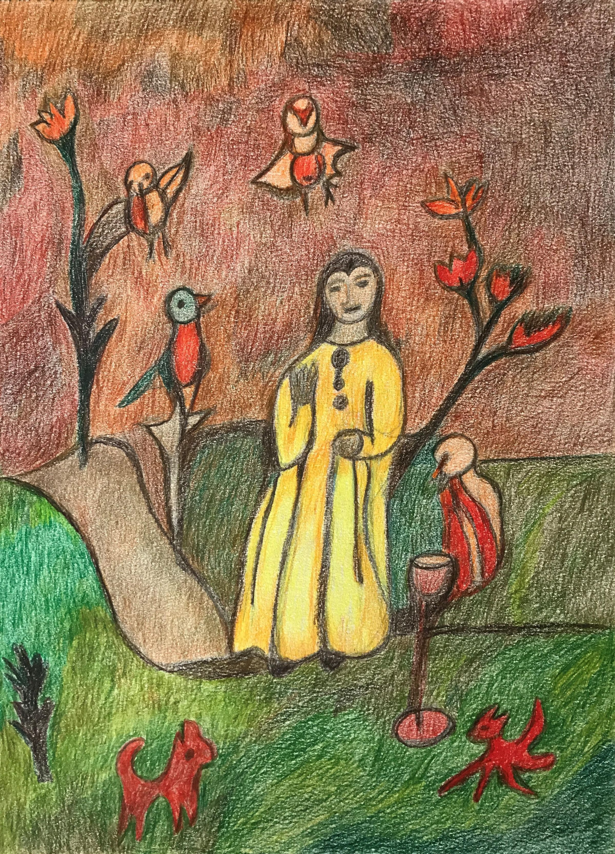 Gretchen has been interested in art since her childhood when she made art with the children she babysat, and despite serious vision issues continues to this day. What she describes as her best painting was a huge tiger, which she had to stop painting because it kept getting “bigger and bigger.” She’s a fan of Frida Kahlo and her AWE art teacher describes her work as “having a shamanic, Native American feel.”