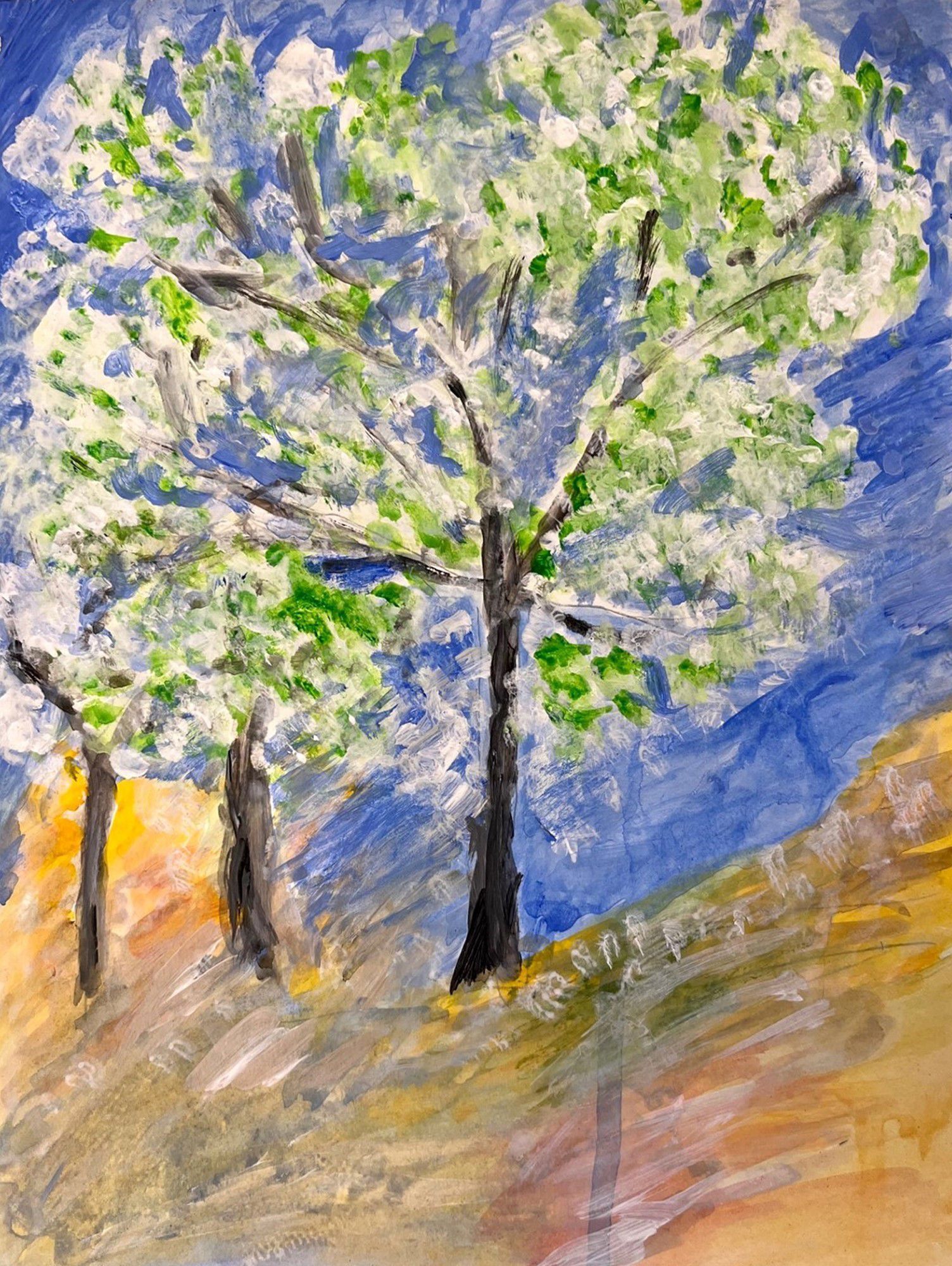 I passed by the art class on the way to exercise class and became intrigued. I never painted before and was quite hesitant especially with my vision. The teacher taught me some watercolor basics which gave me the confidence to do a "real" painting.