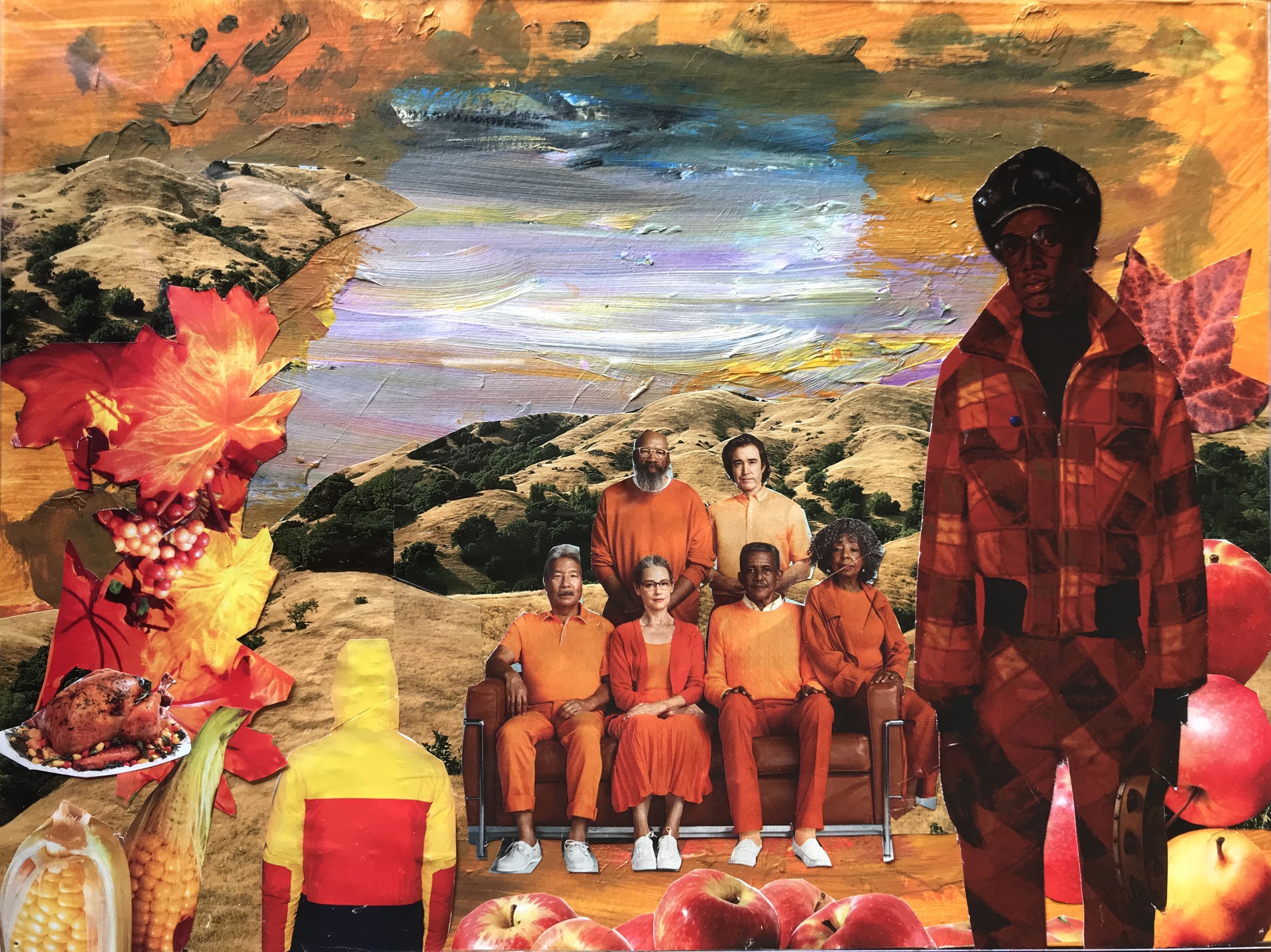 This piece is an expression of what is elicited in the artist when Fall comes around. The color orange permeates his reverie. The rolling hills of northern California come into focus with hues of purple in the sky. Folks in their finery gather around meals and share community and family. Gratitude abounds for having access to that food. These imaginary responses are formed in at his home alone as he continues to face cautionary precautions brought upon by virus variants. Acrylic paint and cutouts from magazines and junk mail were used to create this collage.