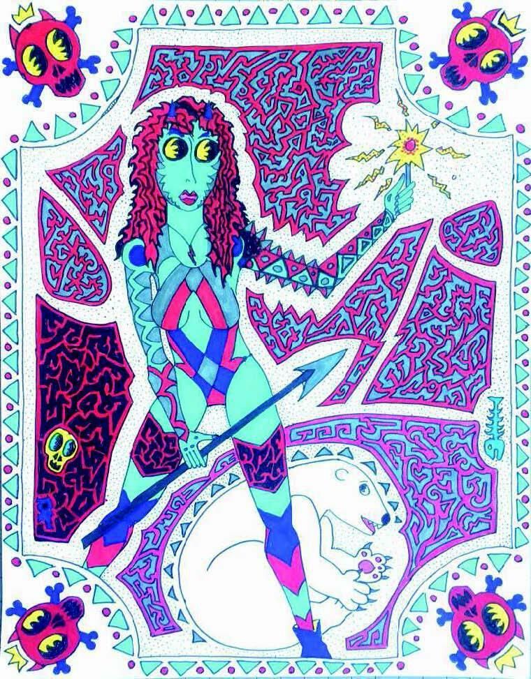 She is a very prolific artist. Her drawings are very intricate, detailed and colorful. “Psychedelic!” one might think. In addition to selling her paintings, she supported herself making jewelry. Using metal scraps left over from her classes at UCSF, she made one of a kind pieces which she sold on Castro Street. Other street artists sold their work during the day. Wanting to have the street for herself, Teresa sold her jewelry at night. Teresa’s drawings always tell a story. The story she is telling these days is about women and how powerful they are. “Women can save the world,” she says. “Eventually, women will save the world!”