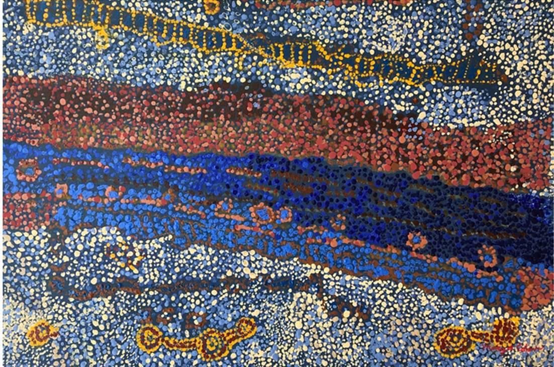 Color always appeals to me! this was an interesting and striking combination of color and surfaces to project that color. It takes a kind of strength to pull that out and all together! Painting this was a strong learning experience and the first time I had experienced and been inspired by aboriginal art.