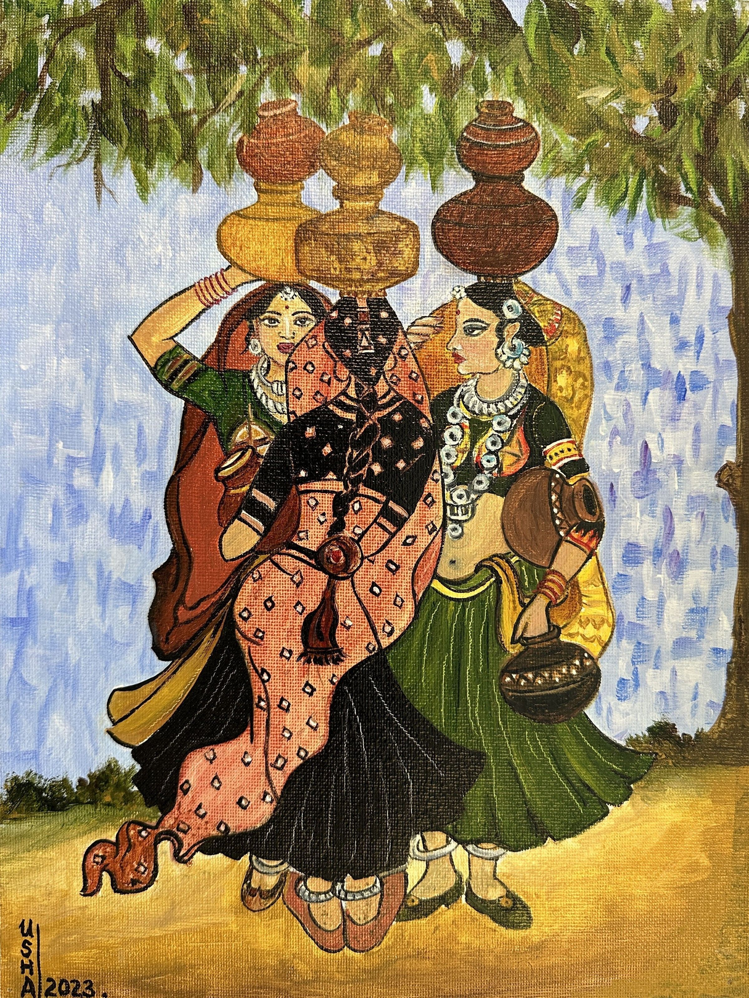 On Lok Peralta - Usha Bhatnagar - Gossiping - oil on board - Selected