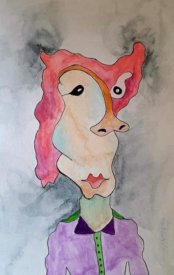 I look forward to using what I’ve learned and spend several hours each week working on various art projects, which is a new experience for me and very satisfying. I look at everyday things in my life or ideas that have been running around in my head and see how I can incorporate them into my art. The pieces I’ve submitted for this exhibit are recent examples of my work in watercolor and ink.