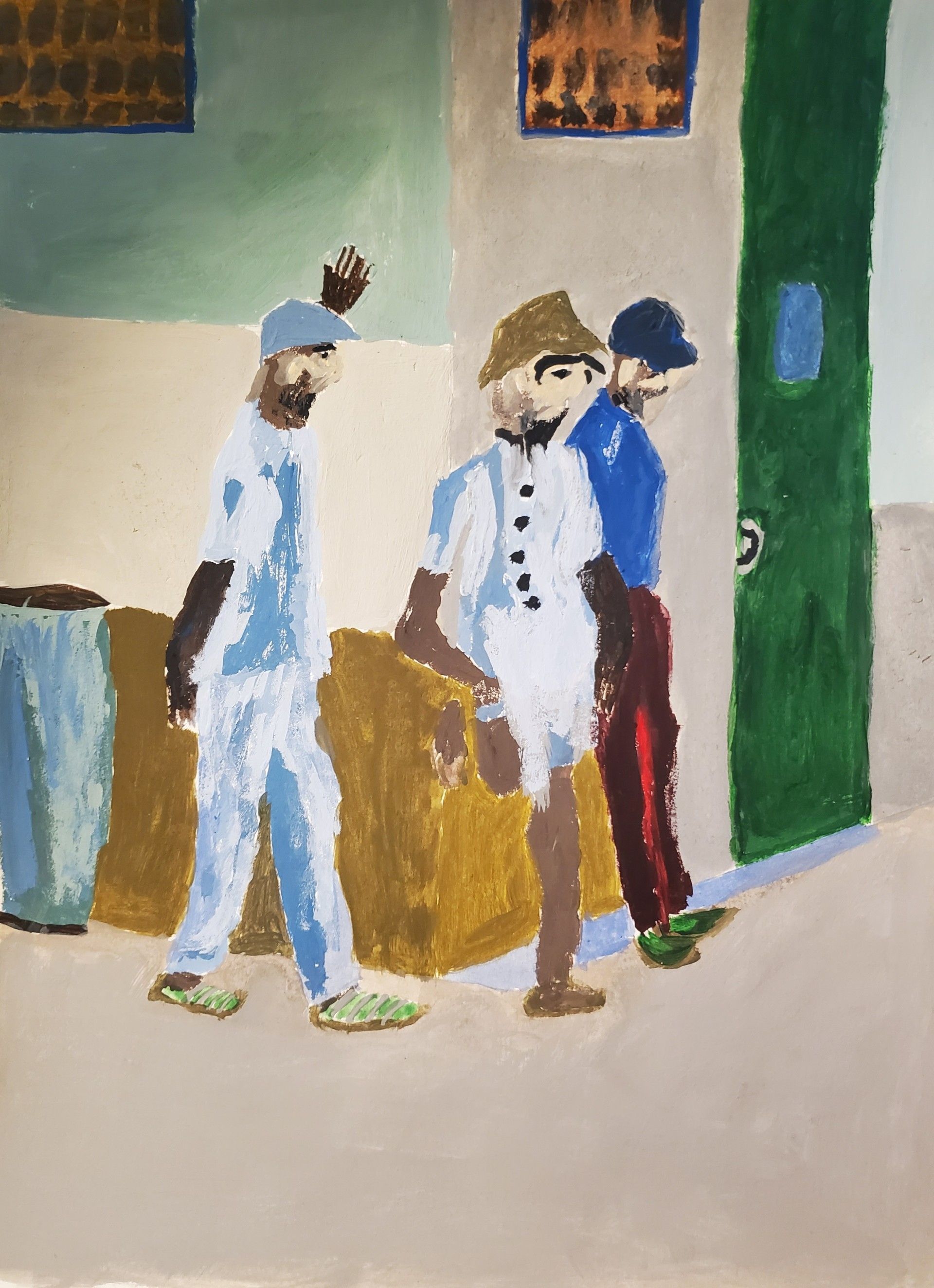 Openhouse Sat. - Gary Allen - Father, Son and Grandson Discuss the Future - 9x12 acrylic on paper - Selected