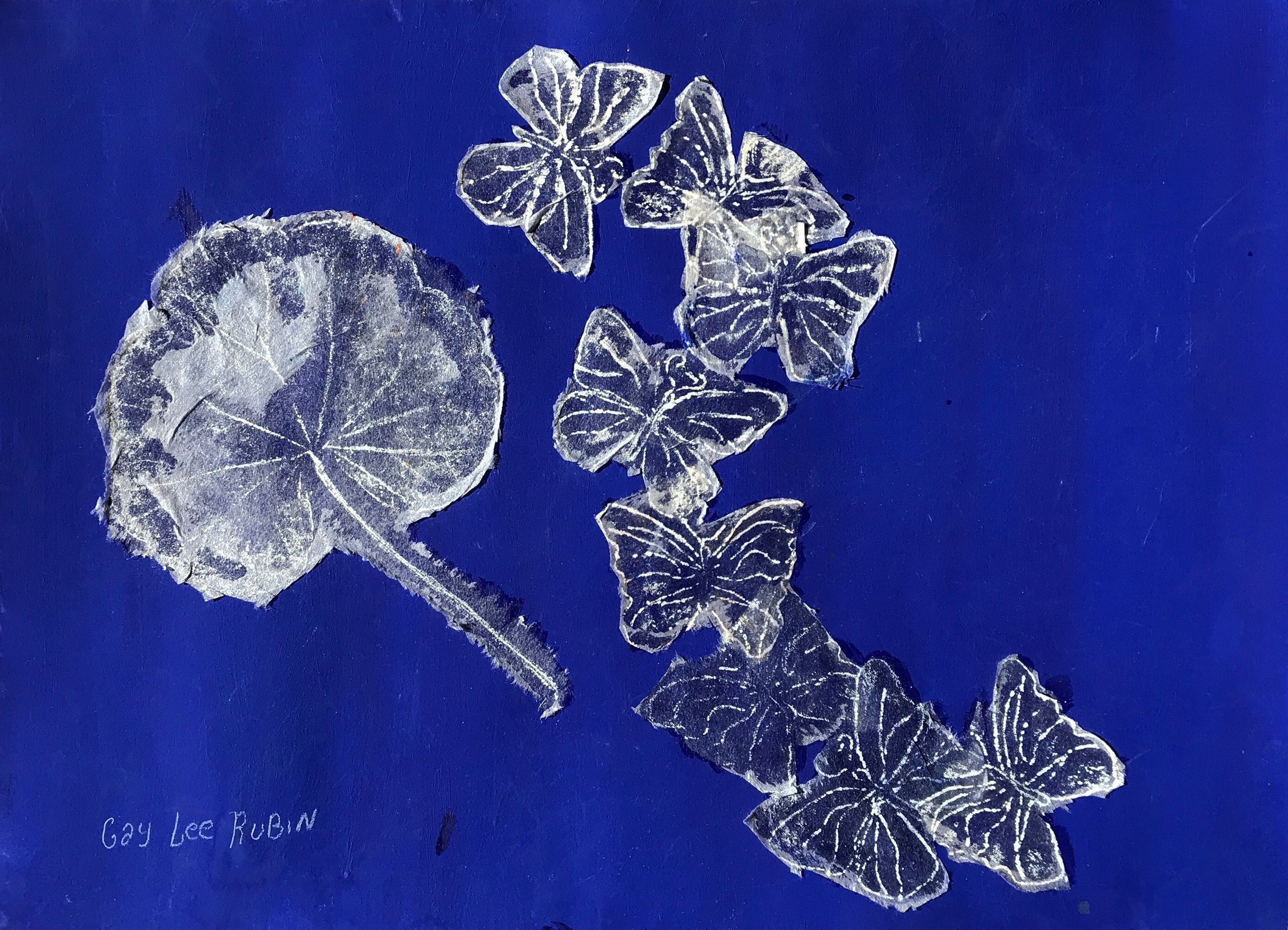 “I began this painting with a blue background; then, I created rubbings of butterflies in white crayon on transparent paper. The next step was to cut out their silhouettes and arrange them in a design that showed them flying together. When I glued them onto the blue ground, in my eyes, they BECAME BLUE butterflies. Then, they could be seen and known by anyone.”