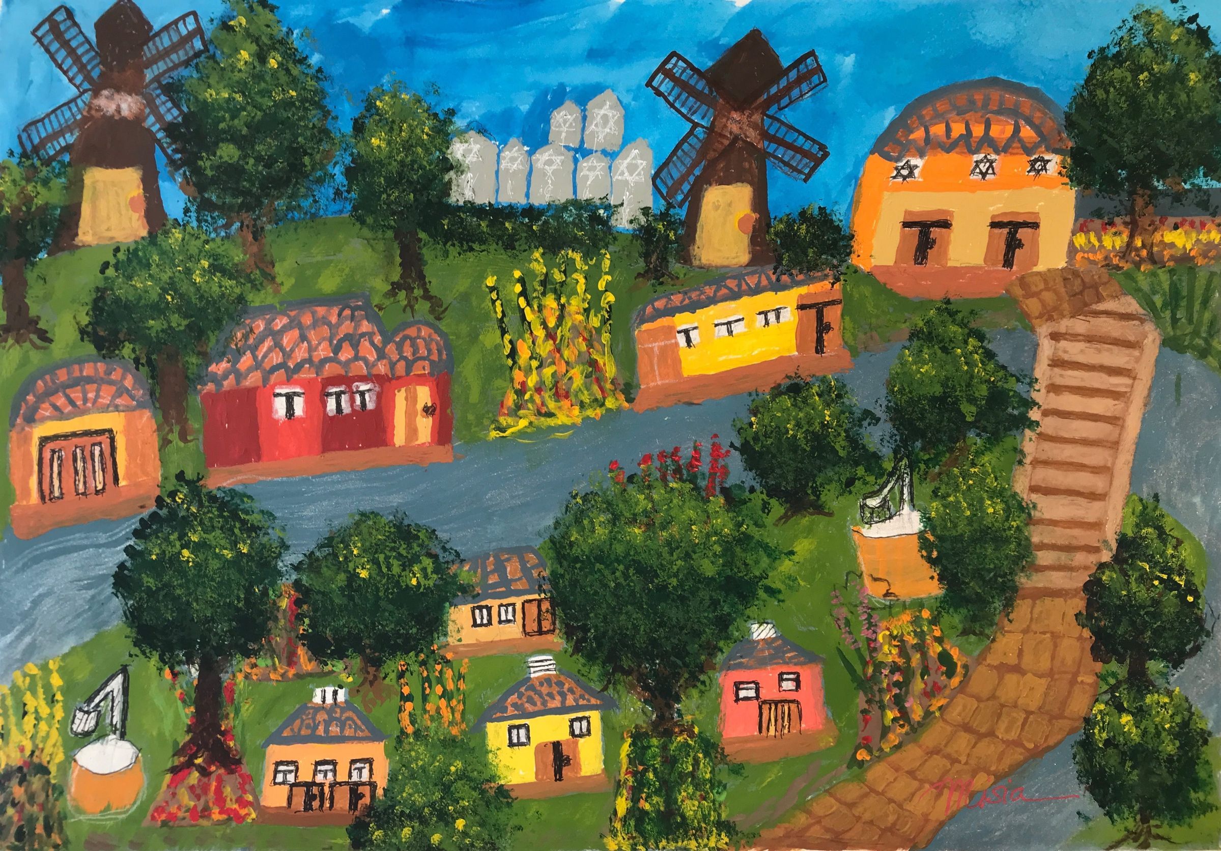 “I grew up a happy child with wonderful parents and family; I still miss them dearly. Although I lived through the Holocaust, these memories are still with me and bring out the best in me. Working on this painting was a way to remember my childhood. I looked at maps to find where the town was in the Polish countryside. After this I worked on remembering and sketching locations of important parts of the town: the synagogue, the windmills and watermills, the river and bridge and the house where I was born. I combined these elements and created the design. Although the village wasn’t as colorful as this, I added the colors to bring out my feelings.”