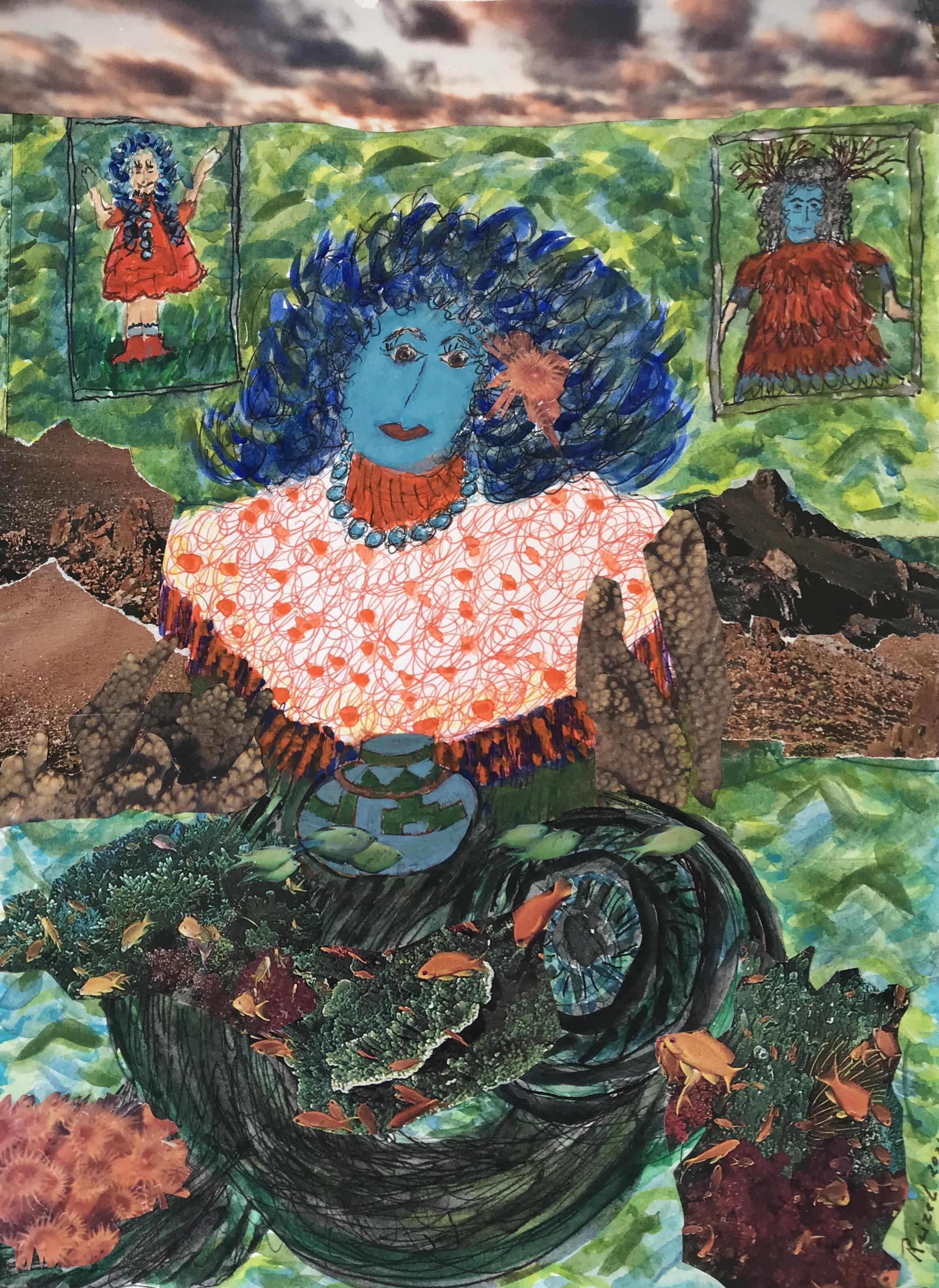 I began my career in art at age 9 painting doll faces and decorating doll hats for my dad’s business! As a preteen, I took myself to the Montreal Museum of Fine Arts for Art Classes and my first Museum experience! Museums became my passion. Working as a Museum Curator for five decades allowed me to experience many artistic traditions including Ethnographic Art and Indigenous cultures. My own art work is a blend of it all- mythological, realistic and spiritual. The central figure of “Three Raizels” is in transformation from human to sea creature. Her lower half is a whale’s tail that ends in the wheel of a wheelchair. Above are Raizel as a young child and her great grandmother who sent her back from the other world when Raizel was in a coma. The horns growing from her head reminds me of G-d sending a ram to Abraham to stop the sacrifice of Isaac; thus, life was saved in the bible and mine in the 20th century. Roslyn Tunis “Three Raizels” 2021 Pen/Watercolor/Collage on Paper 9” x 12”