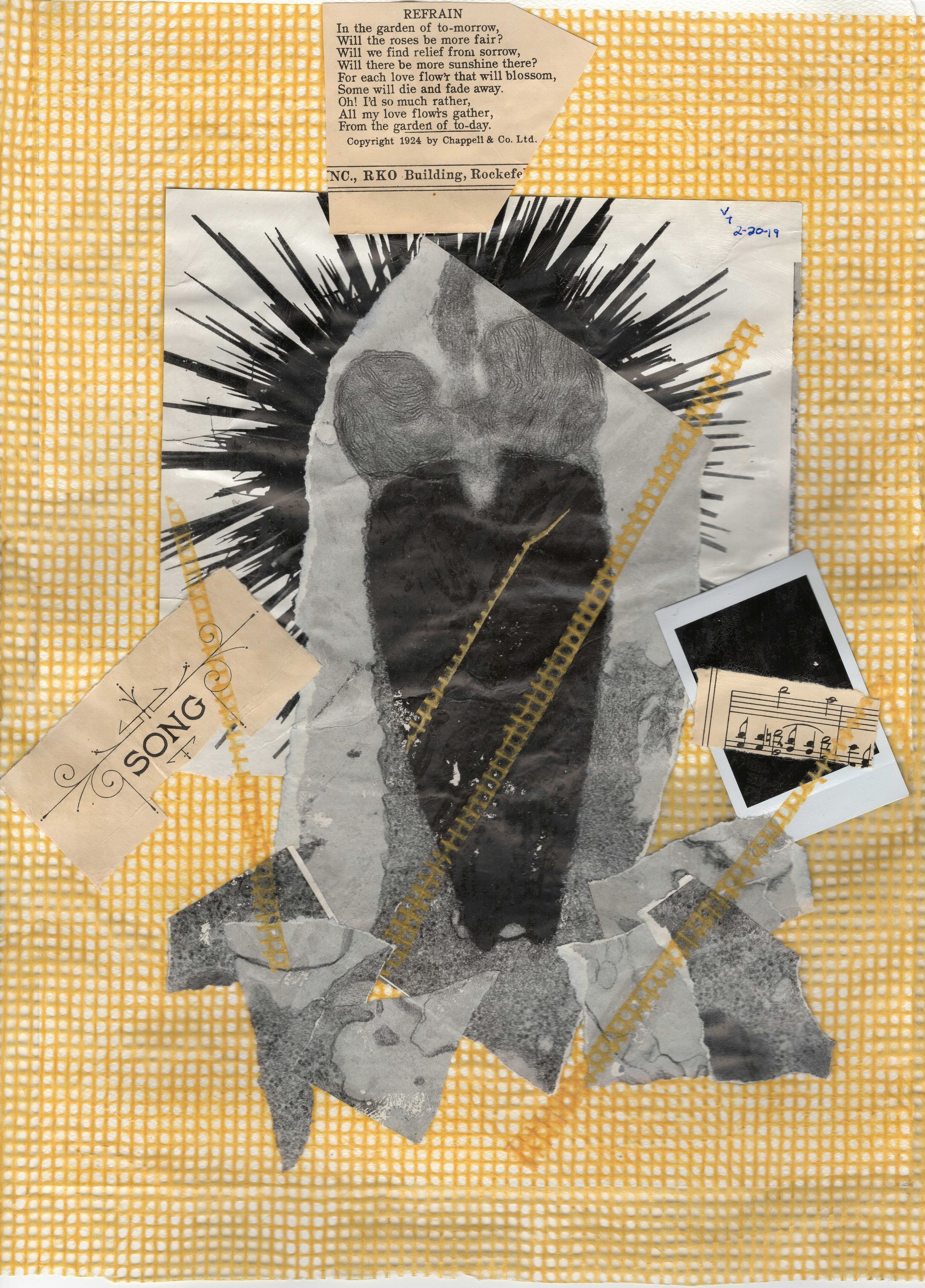 Susan says she created this piece very quickly, in less than 15 minutes actually. She told her AWE teacher she wanted to do a collage. The teacher, Veronicas Rojas, pulled various, miscellaneous items out of a closet and soon Susan had created this piece. Until someone pointed it out to her, she didn’t realize that the central figure appears to be two people about to embrace.