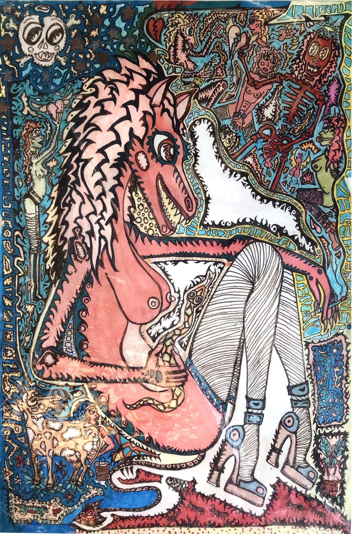 “Art makes the world pretty.” Teresa has been doing art all her life. She studied print making and metal arts at UCSF, but long before that, as a child, she used food coloring to decorate the meals on her dinner plate. Born without a hip, Teresa has been disabled since birth. Her father died when she was quite young and she was sent to live with her grandmother. Her heart has already been broken she says and, so, it cannot be broken again. Her goal has always been to decorate everything. Make the world pretty! She is a very prolific artist. Her drawings are very intricate, detailed and colorful. “Psychedelic!” one might think. In addition to selling her paintings, she supported herself making jewelry. Using metal scraps left over from her classes at UCSF, she made one of a kind pieces which she sold on Castro Street. Other street artists sold their work during the day. Wanting to have the street for herself, Teresa sold her jewelry at night. Teresa’s drawings always tell a story. The story she is telling these days is about women and how powerful they are. “Women can save the world,” she says. “Eventually, women will save the world!”