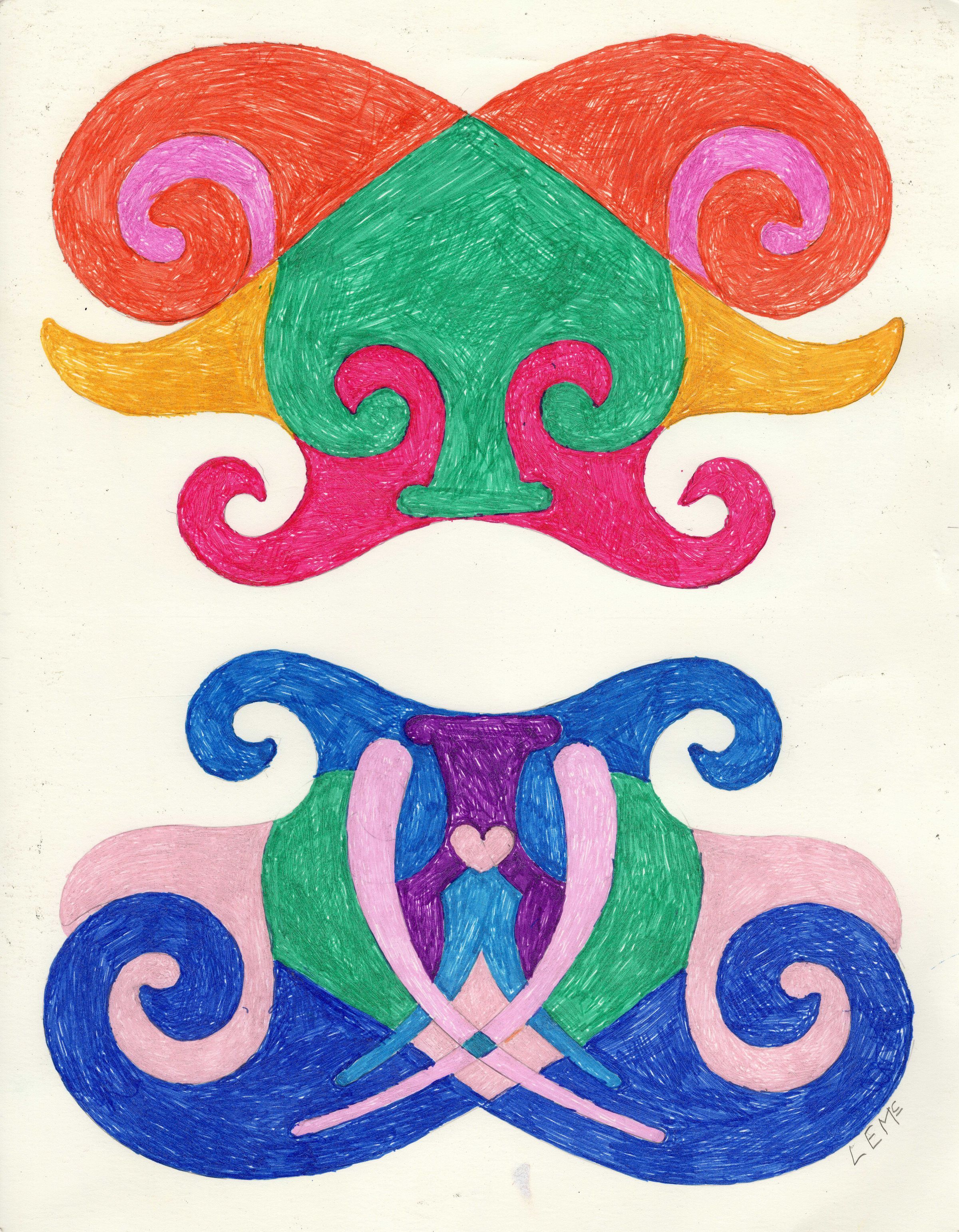 On retiring, Larry moved into Vallejo Hills Retirement Community, where he has been not only a resident, but also an actively engaged community member since 2006. Larry manages The Country Store at Brookdale, and is also involved in the Senior Coalition of Solano County. He met his partner, fellow AWE student, Susan M., in 2016. Susan encouraged Larry to join her in art class. He started by coloring geometric designs in a coloring book and soon he was creating his own designs using a straight-edge and French Curve, experimenting with color arrangements using his preferred medium, glitter gel pens. Larry takes his work through another step by scanning his images to computer and using digital media techniques for his final output.
