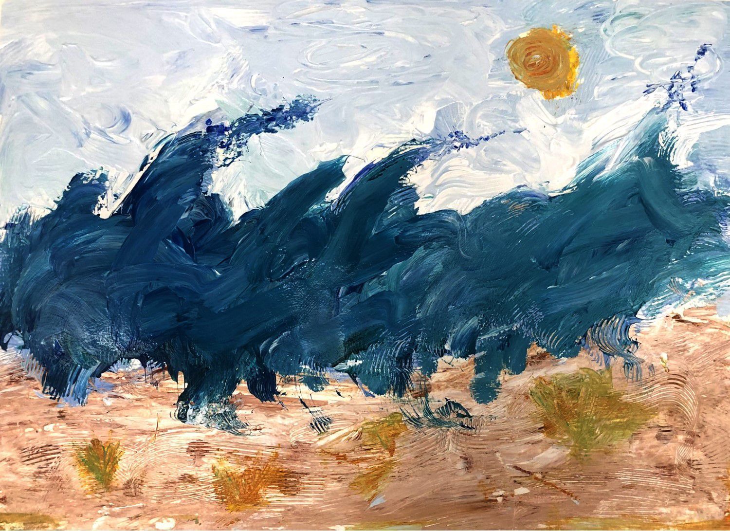 Gloria works mostly in watercolor. She likes to see how water flows on the paper. Her “Rough Water” piece is different than anything she has done, and she worked in acrylics for the first time. Gloria shares that Megan, their instructor, encourages them to overstep their boundaries.