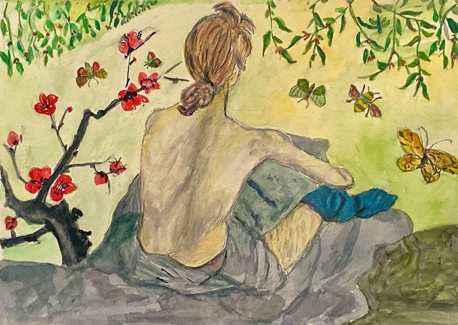 She likes to paint scenes from nature and is interested in the human figure. She has worked with many approaches to learning to draw and paint, such as drawing from a yoga manual, still life arrangements, self portraits, and by studying painters such as Edgar Degas.
