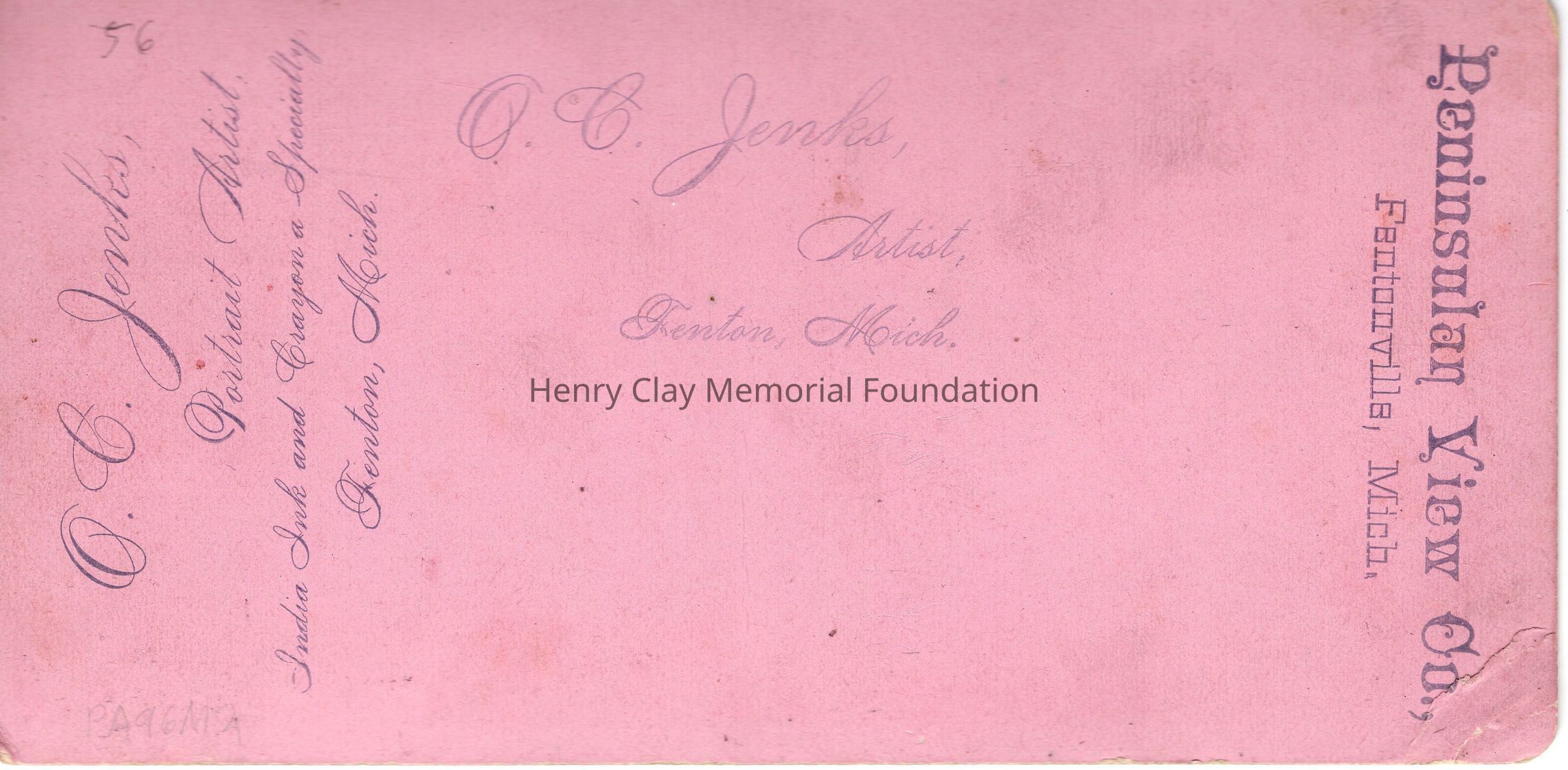 Image of a black man in a top coat, white shirt, and black cravat. He is carrying a hat in his left hand and cane in his right. He is wearing a wig. He is standing on the side of the street and there are buildings in the background. At one end is a picket fence across an alley or open space. The back is pink and printed with "O.C. Jenks Portrait Artist Indian inks and crayon a specialty Fenoton, Mich." at one end. In the center it is printed with "O.C. Jenks Artis Fenton, Mich." and at the other end with "Peninsular View Company Fentonville Mich.".