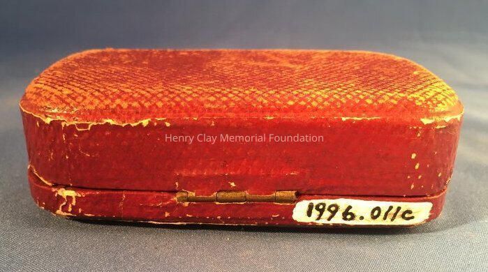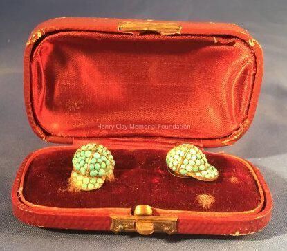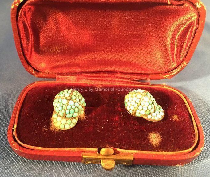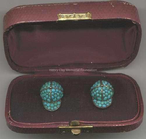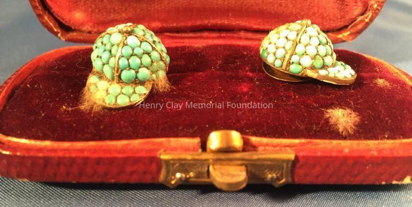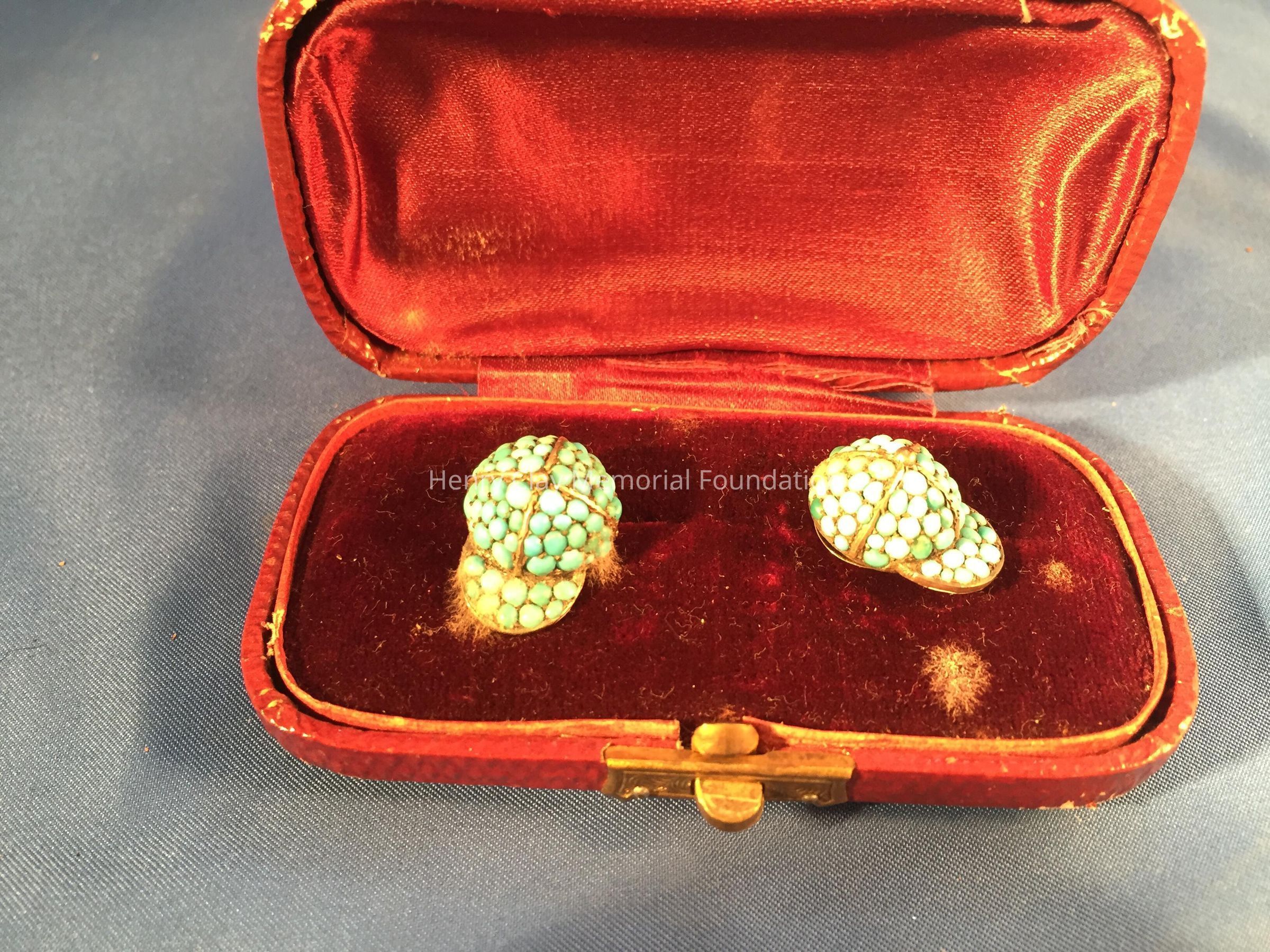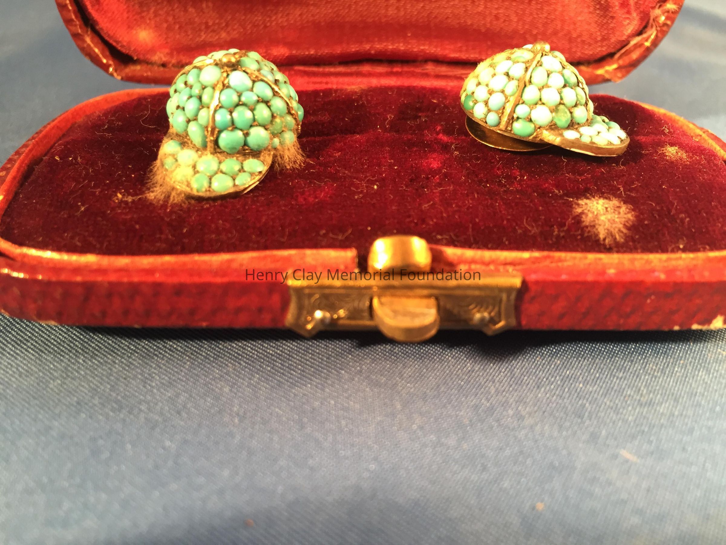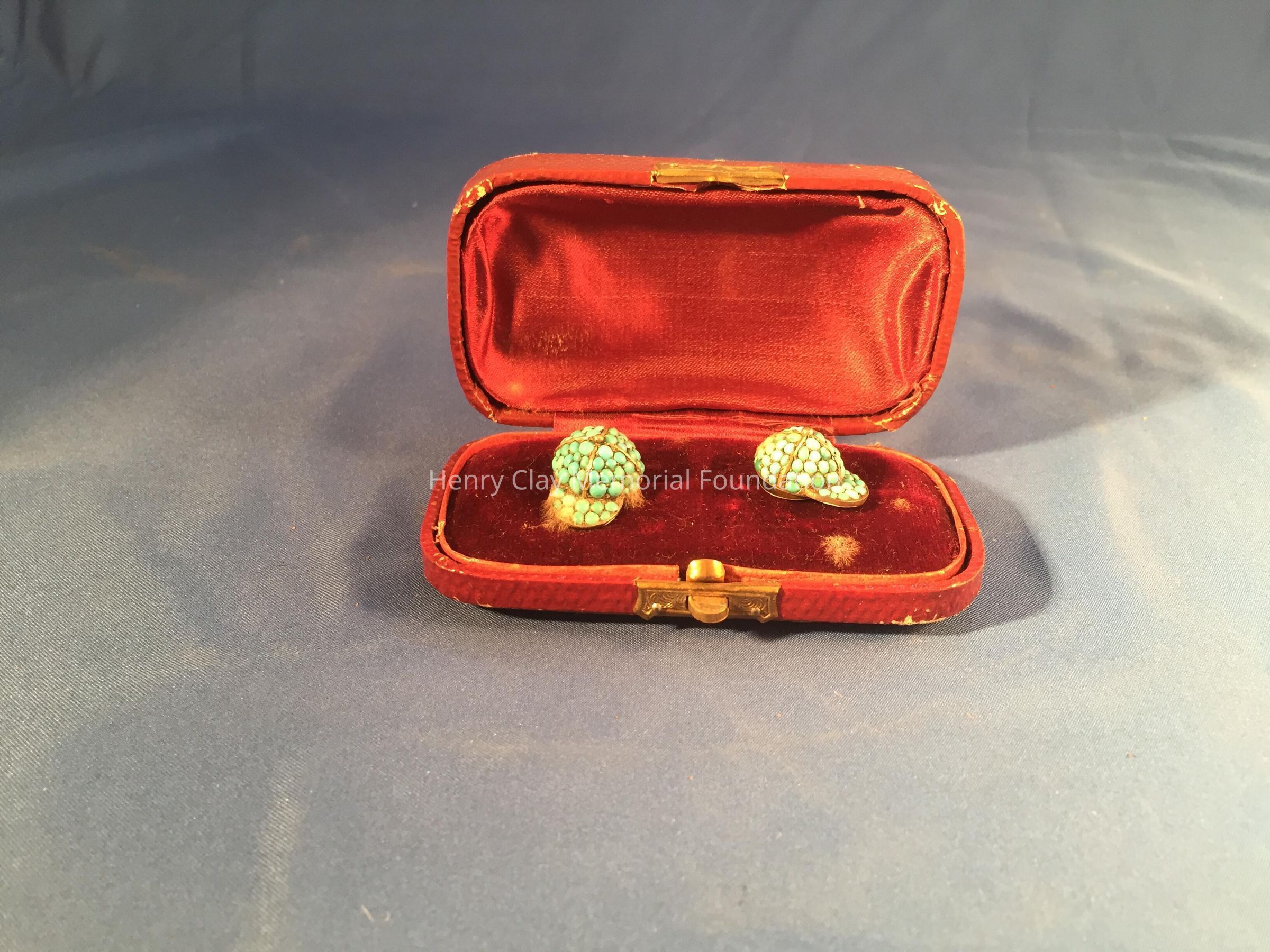 (A-B) Pair of brass or gold cuff links with turquoise beads in the shape of jockey caps. Contained in (C) a maroon, coated paper case lined with maroon velvet and silk. There is a brass or gold clasp to open the case.Dimensions
