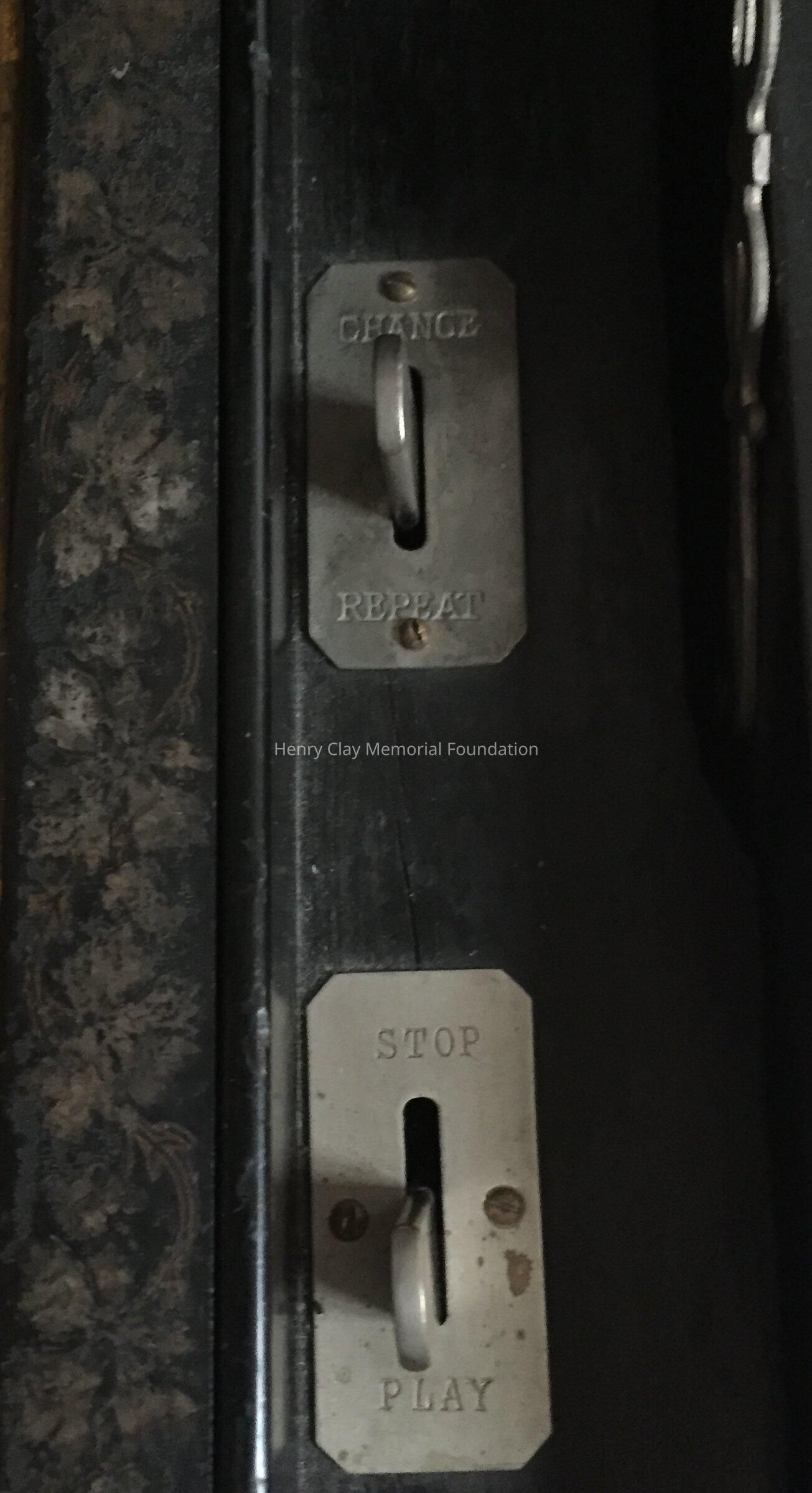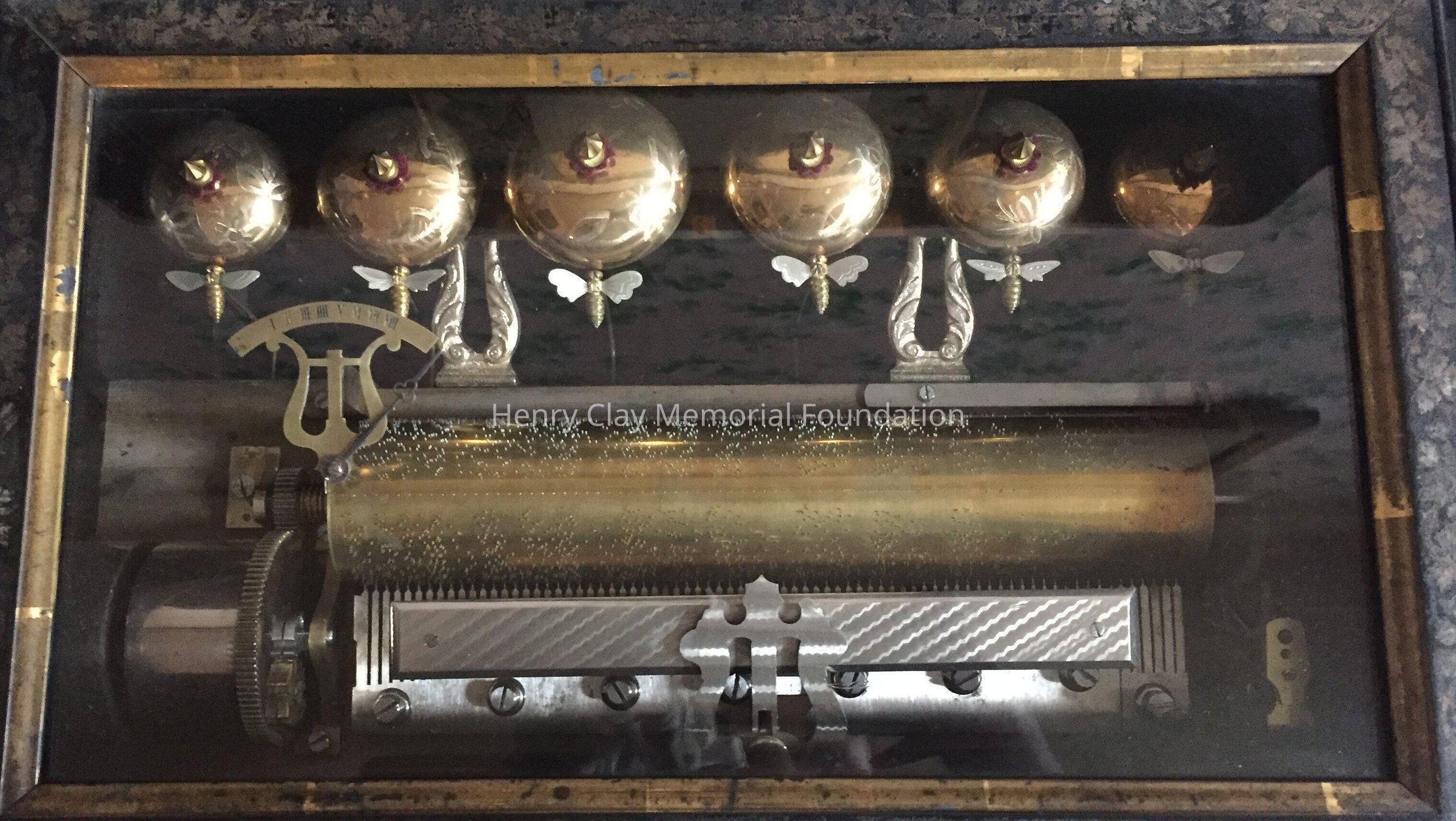 Large wooden music box, black, with veneer centers on each side. Top opens to reveal interior works viewed through a glass door. Mechanism has bell strikers shaped like bees. Six bells. An original card on inside of lid lists 8 tunes that can be played, including "Home Sweet Home," "Auld Lang Syne," & "Pretty Blue Danube."Dimensions