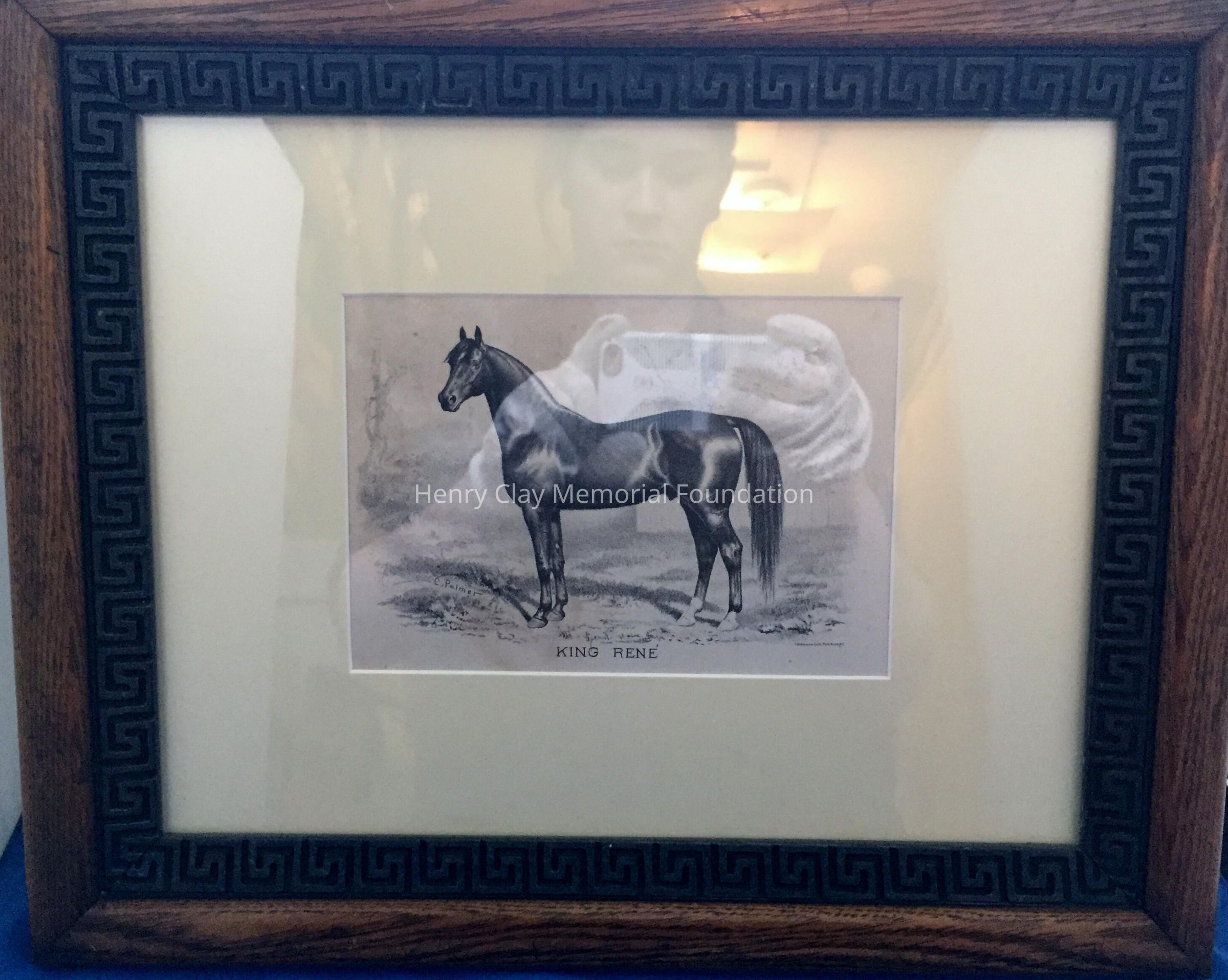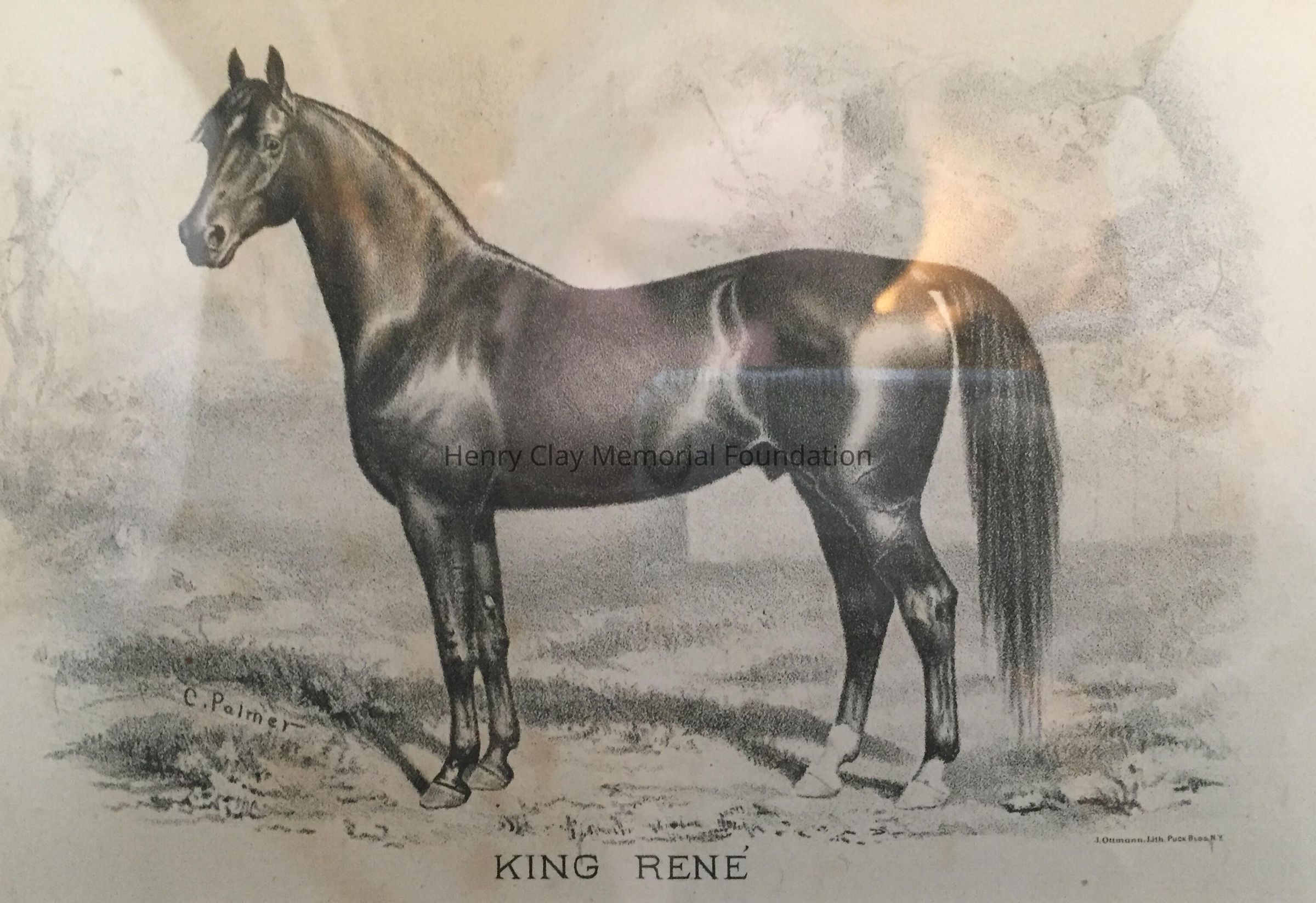 Litho of horse King Rene from drawing by C. Palmer. At bottom right of image: "J. Ottman, Lith. Puck Bldg. N.Y." Original oak[?] wood frame with grey Greek decoration on inner lip.Dimensions