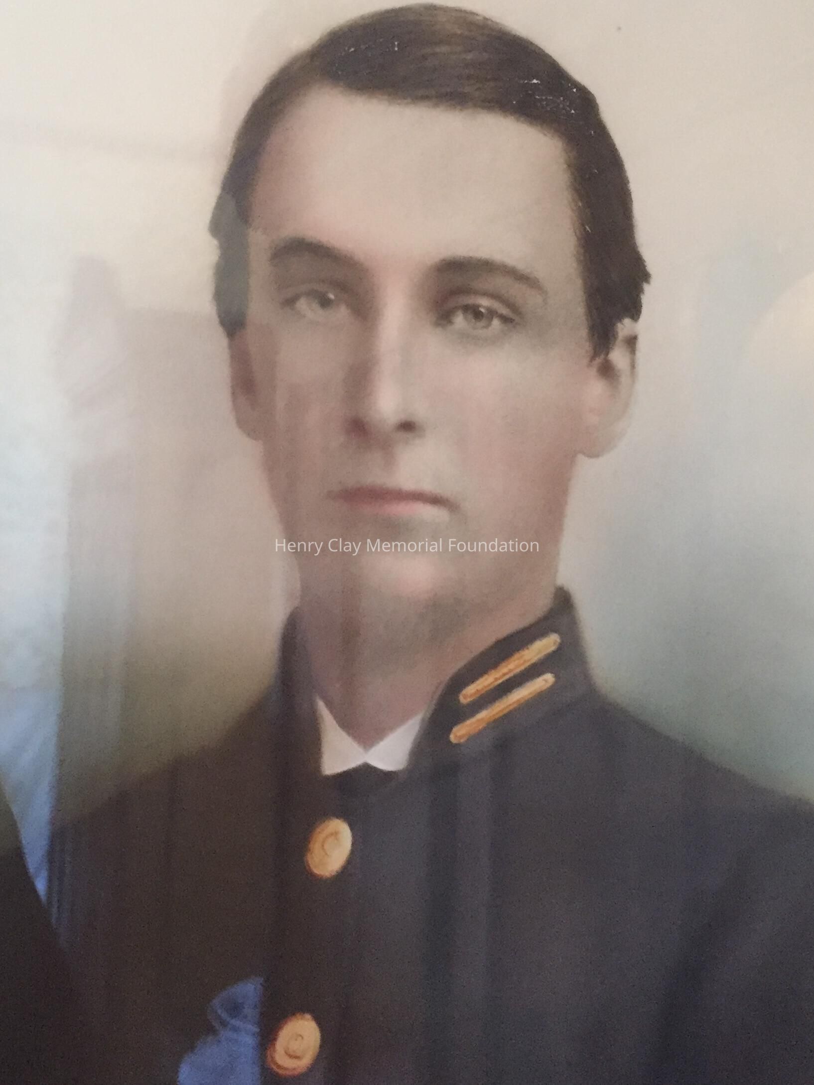 Shows subject (James B. Clay, Jr.) in blue Confederate uniform. Covered with glass. Framed in gilded frame with some ornamentation.Dimensions