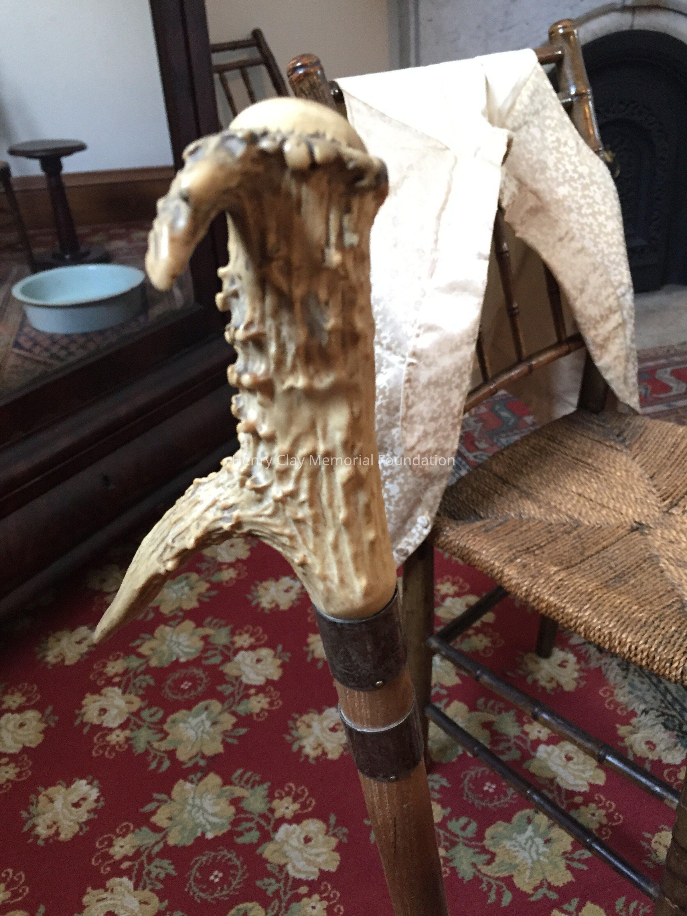 Light-colored wood [walnut ?] cane with metal tip and stag horn handle. Two silver bands are on cane, one inscribed, "Henry Clay to Thomas B. Stevenson."