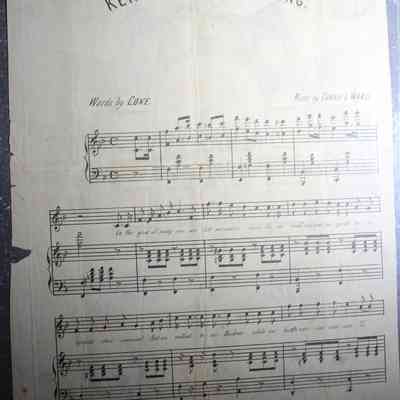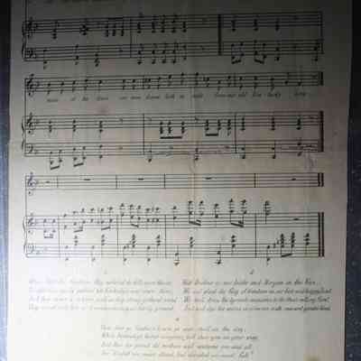 Piece of sheet music dedicated to the 1st KY Brigade, CSA, also known as the Orphan Brigade. This was Kentucky's largest Confederate unit and got its name from the way the Confederacy viewed KY units since KY was officially neutral. The cover of the sheet music features an arch with names of prominent members of the brigade on it and flags of various battalions of the brigade. The music cover has been hand-colored in red and blue.Dimensions