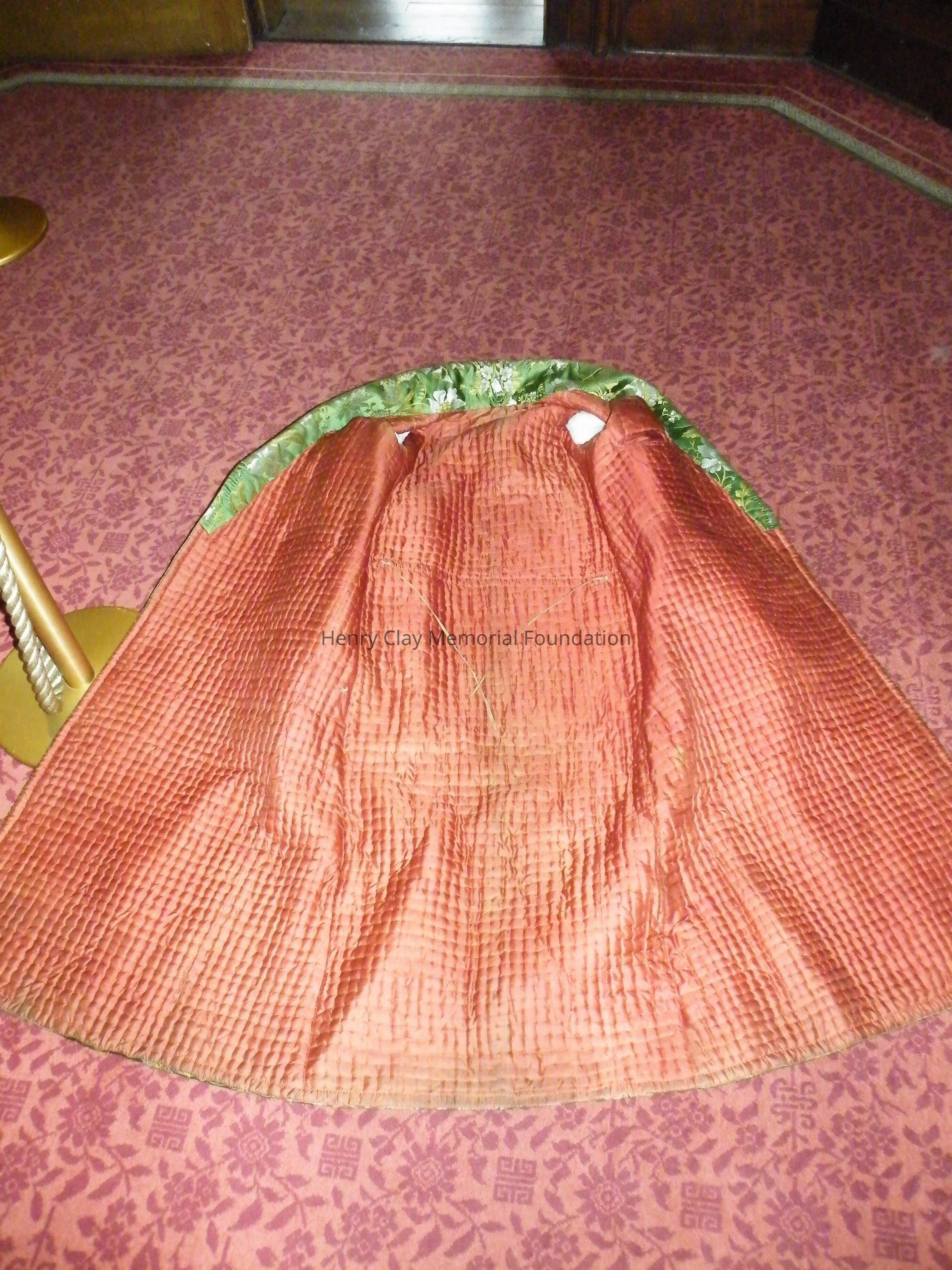 Green robe embroidered with small white and yellow flowers. Inside is quilted with red fabric. Sleeves have cuffs. Interior pocket on left breast. interior drawstring. 3" exterior [?] on both sides. 5" pieces of cloth extend from body of robe with 2 buttons on each piece of cloth; one button hole on each piece. 4 belt loops around exterior waist. 2 exterior hip pockets.