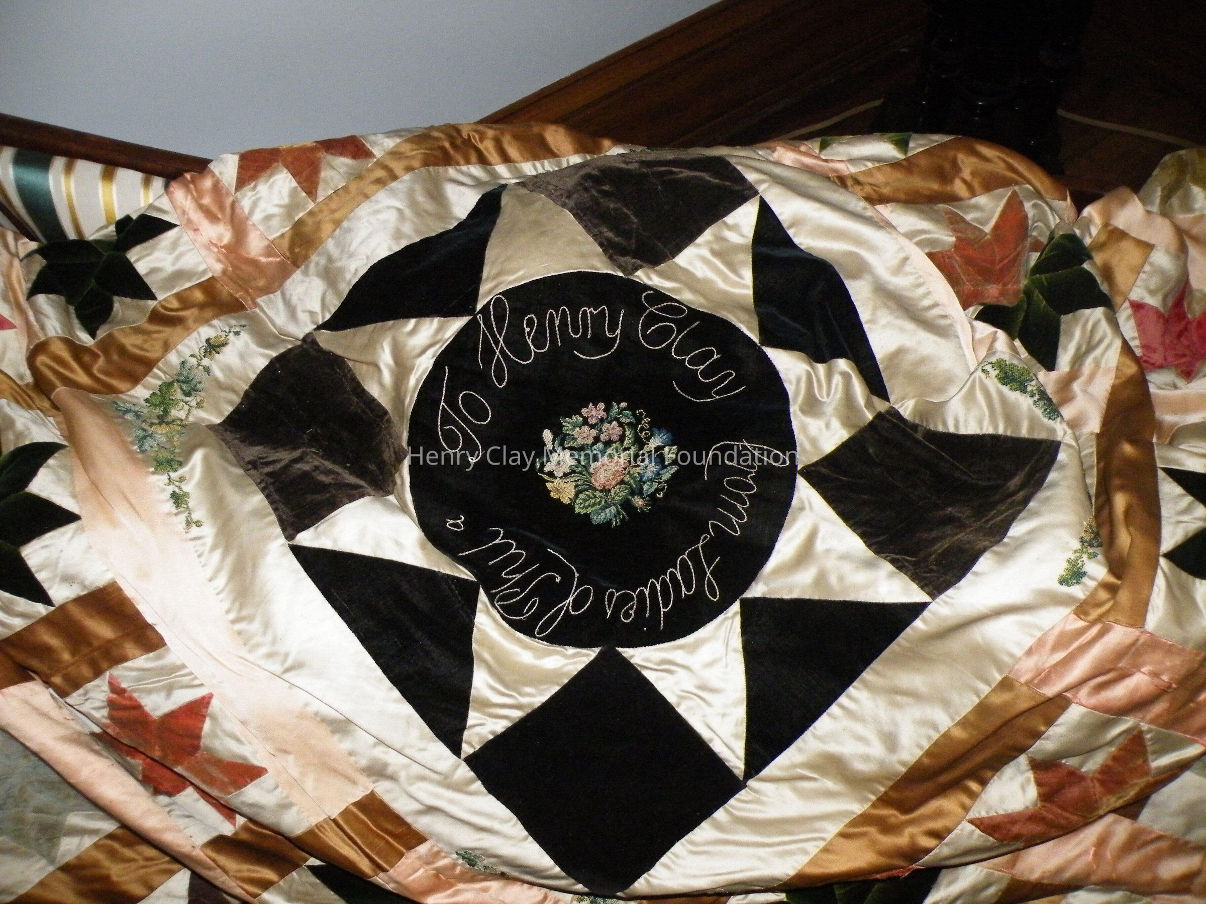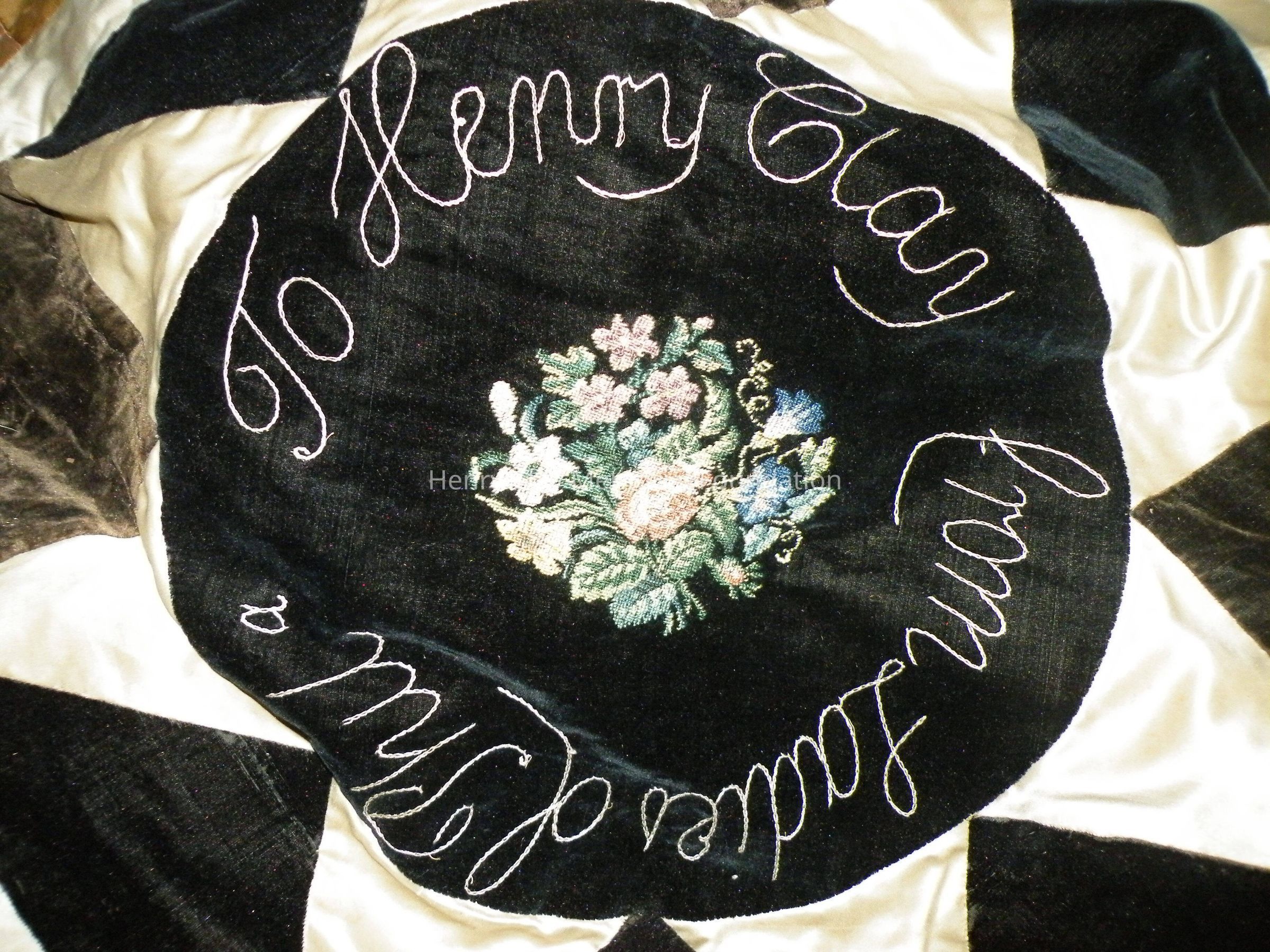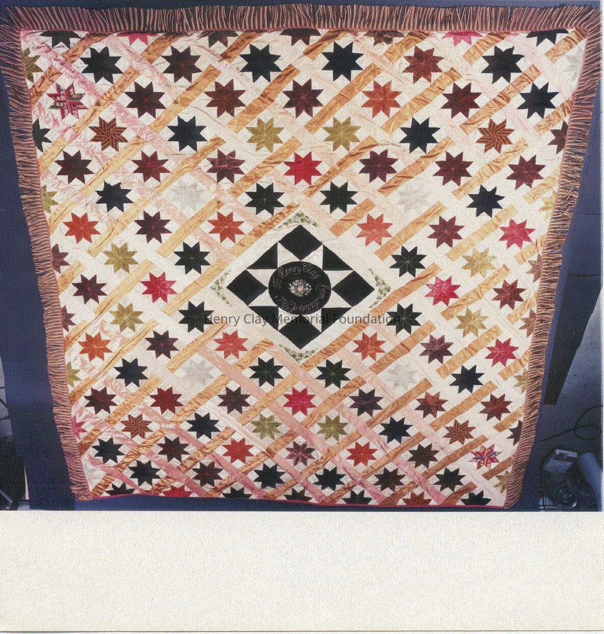 Mulit-colored velvet and satin star pattern quilt with large star in the center and a black velvet medallion in the center of that. The medalion has an embroidered bouquet in the center with script in white around the perimeter reading, "To Henry Clay from Ladies of Phila." The surrounding white background forming a large sqaure around the medallion had embroidered flowers in each corner. Lattice work strips contain each star. There are 54 pieces of lattice. There are 30 half squares (and half stars) around perimeter and 88 full squares containing full stars. Pink and green fringe around 3 edges of quilt (not at top).Dimensions