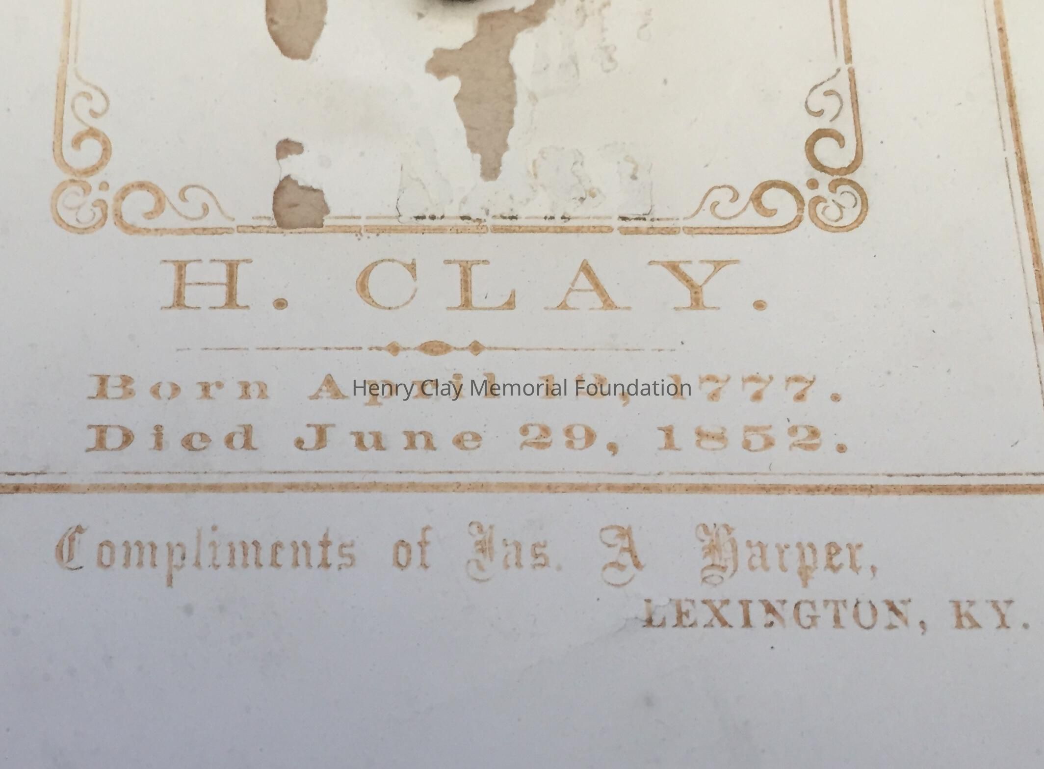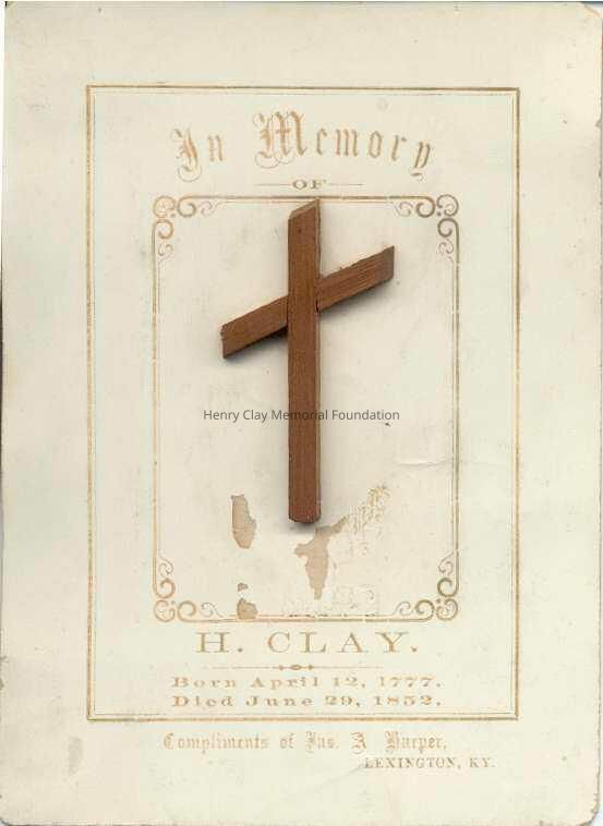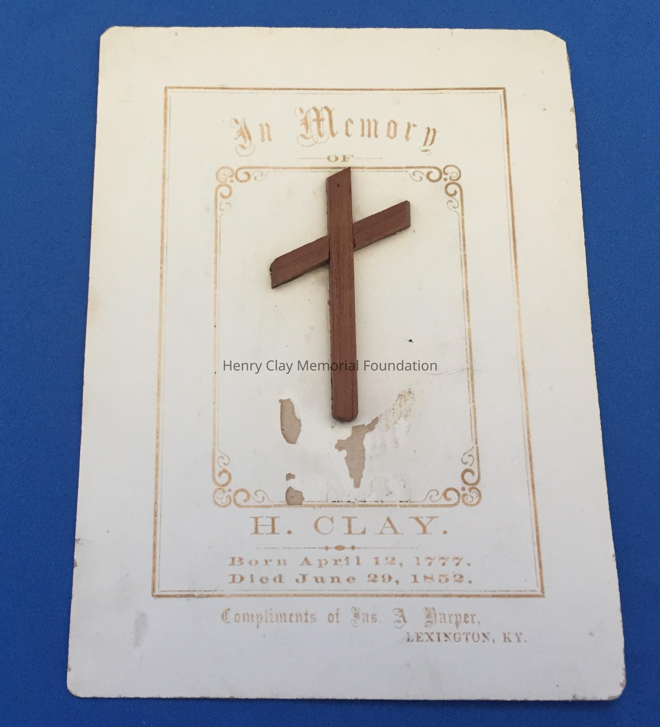 A white, glossy, rectangular card with a wooden cross adhered to center of it surrounded by a gold embossed rectangle. In gold embossed lettering starting at top of card and continuing beneath cross, "In Memory / OF / H. Clay. / Born April 12, 1777. / Died June 29, 1852." At bottom of card, also gold embossed, "Compliments of Jas. A. Harper / Lexington, KY." On back of card written in pencil, "Compliments / of / Len Varalle / Oct 16 1866 / Louisville Ky."Dimensions