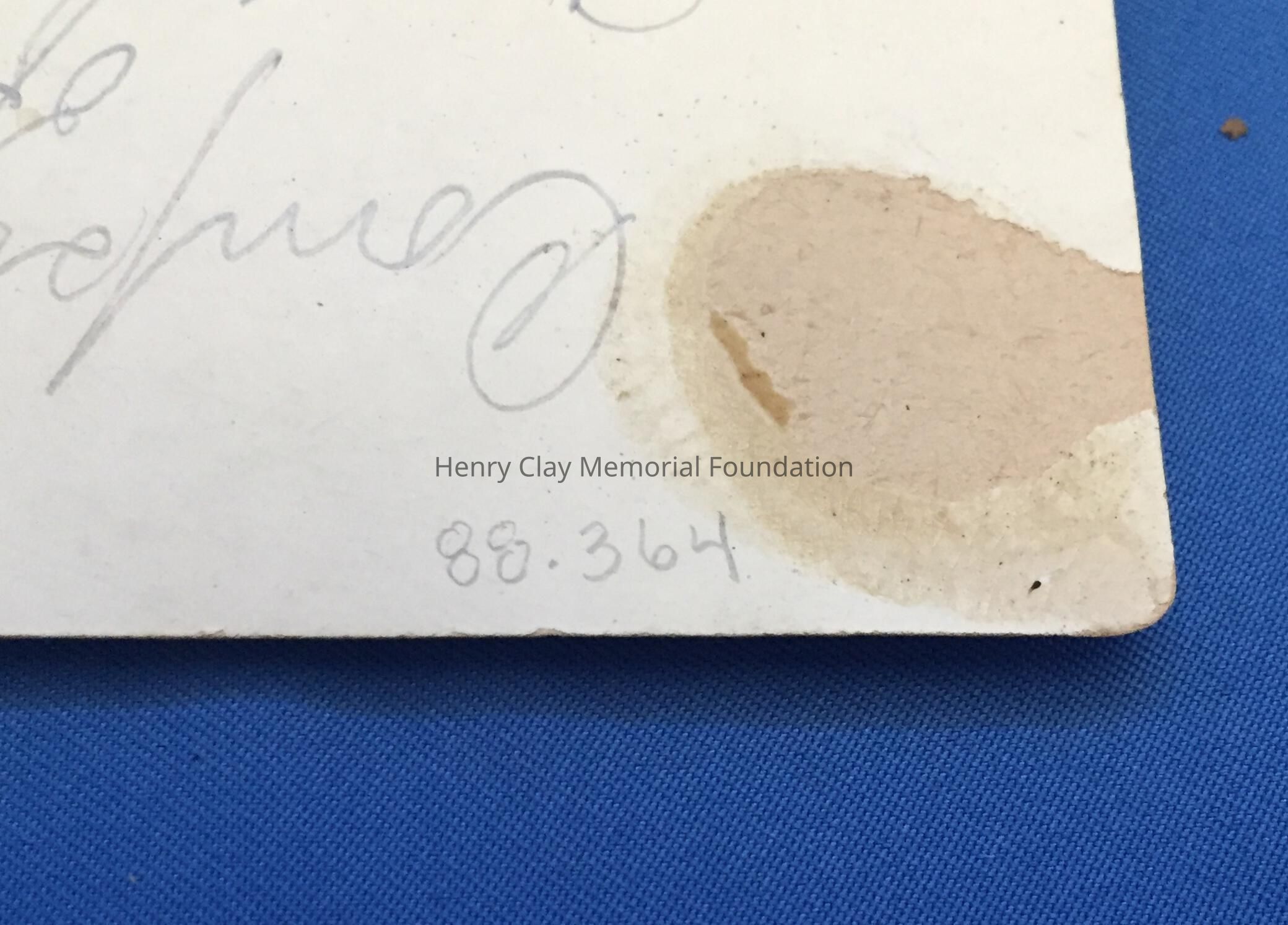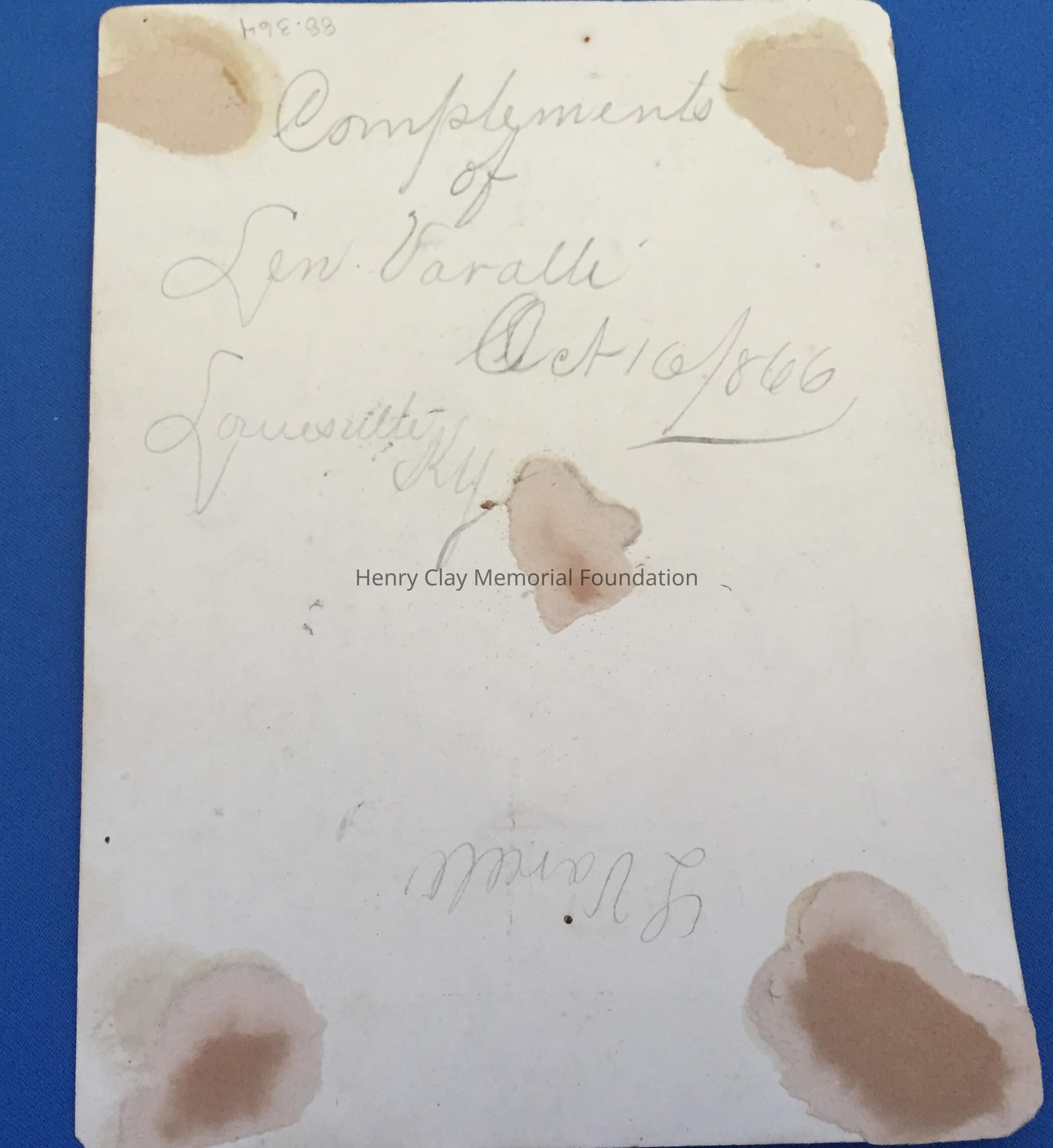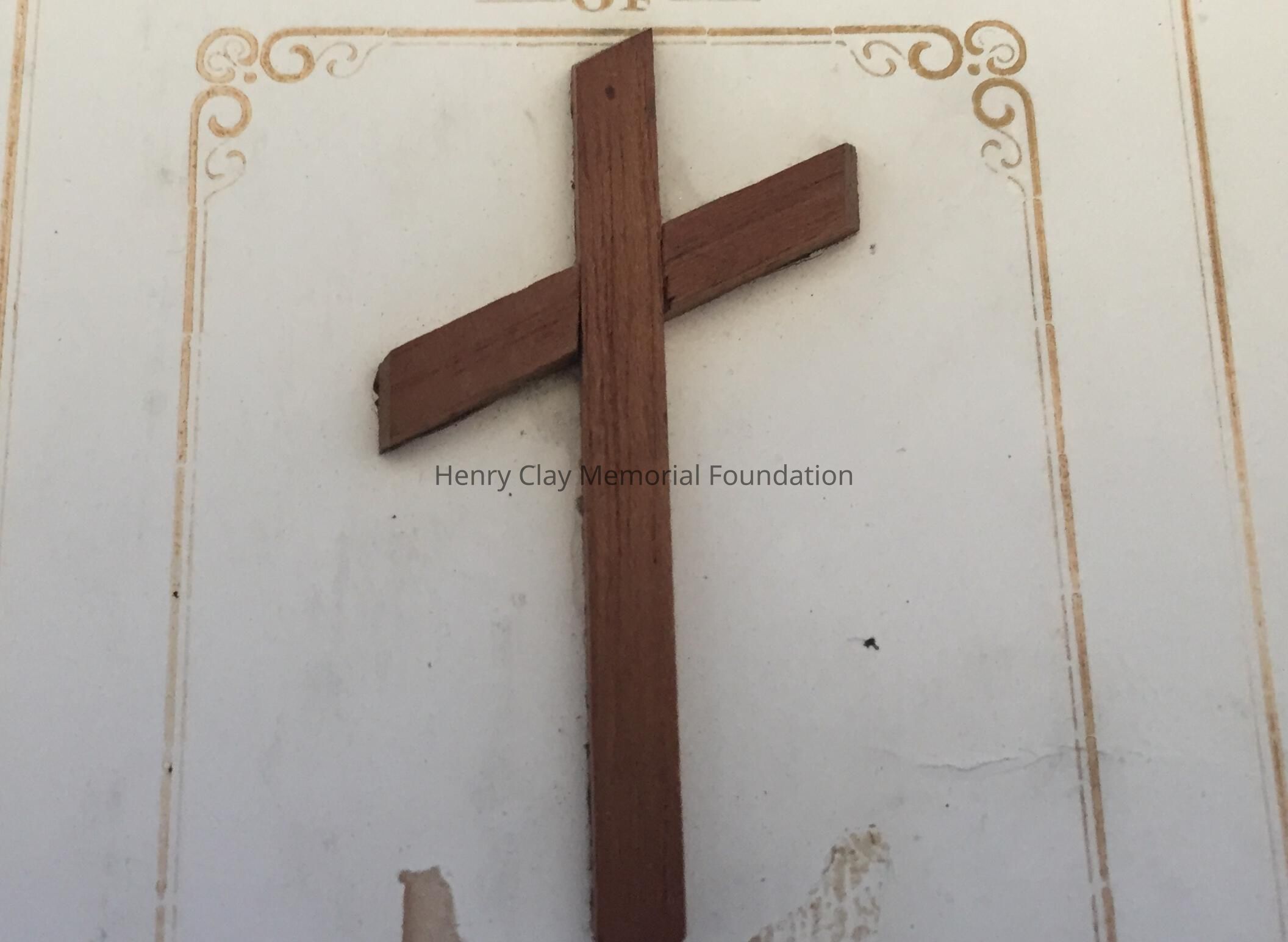 A white, glossy, rectangular card with a wooden cross adhered to center of it surrounded by a gold embossed rectangle. In gold embossed lettering starting at top of card and continuing beneath cross, "In Memory / OF / H. Clay. / Born April 12, 1777. / Died June 29, 1852." At bottom of card, also gold embossed, "Compliments of Jas. A. Harper / Lexington, KY." On back of card written in pencil, "Compliments / of / Len Varalle / Oct 16 1866 / Louisville Ky."Dimensions