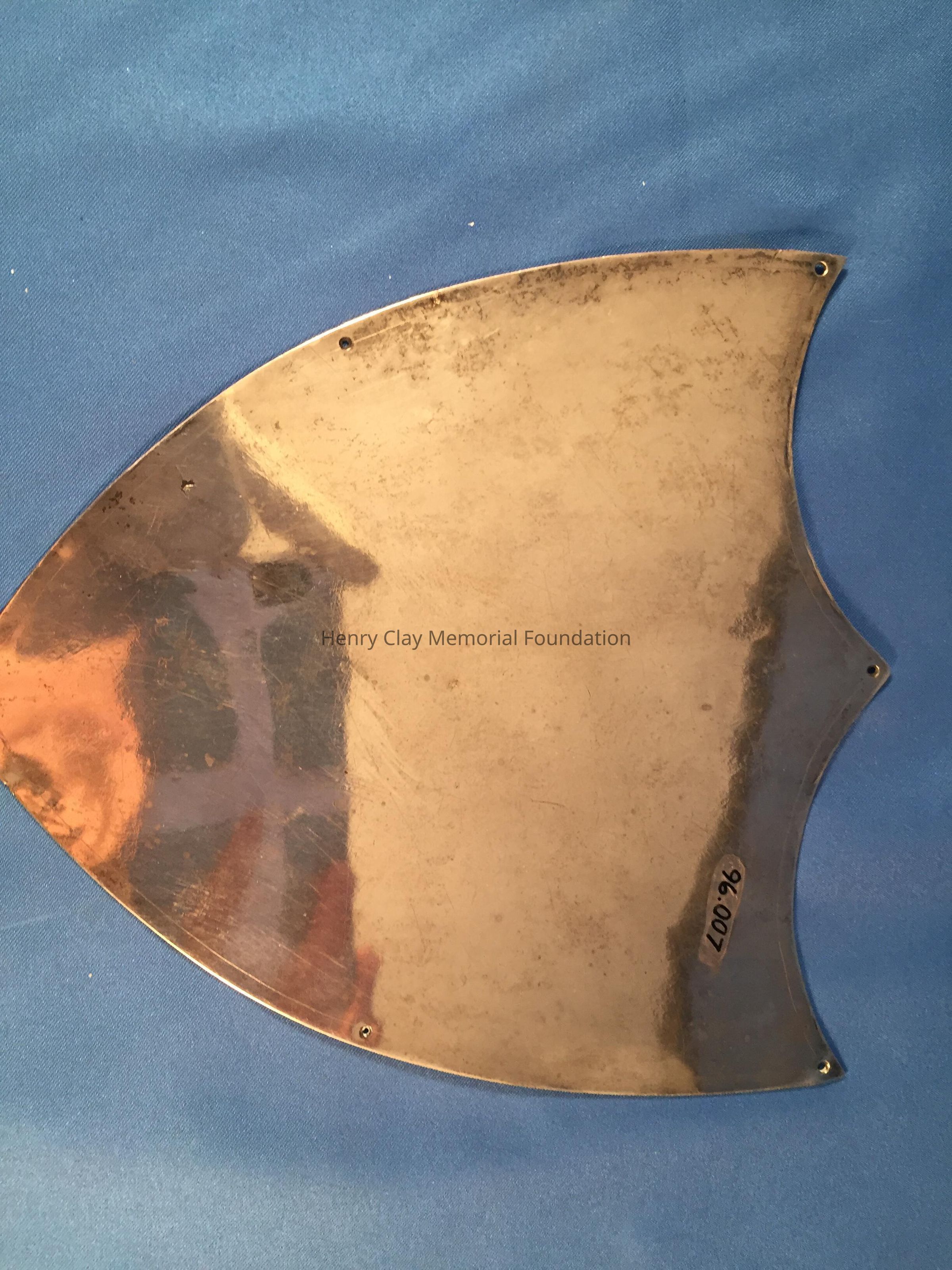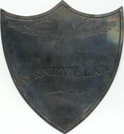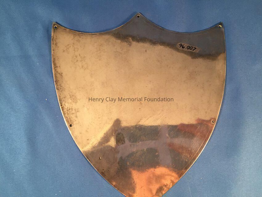 A flat shield-shaped nameplate, pointed at the bottom with three points at the top. An eagle is shown at the top of the shield with a wavy "HENRY CLAY" across the middle of the shield. At the bottom is a vertical arrow with a swirly design around it. Around the perimeter of the shield are eight holes, possibly for securing it to something.
