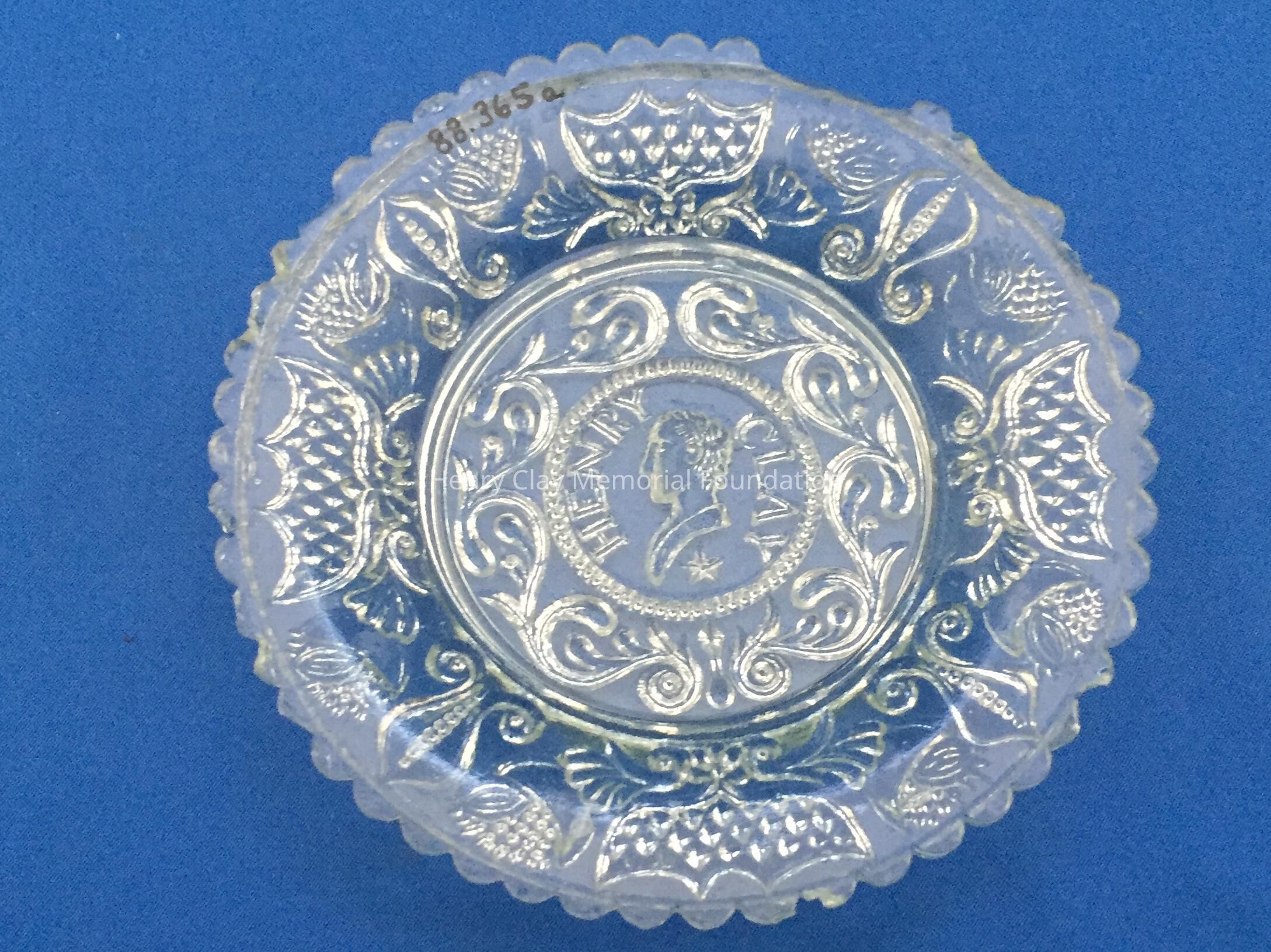 Small pressed glass plates with a bust of Henry Clay facing left in the center. "Henry Clay" is around the bust and star beneath him. There are repeated designs around border of plate with single scalloped edge of uniform sized scallops. Four of these plates are clear, one has a green tint and 3 are blue (one of the blue ones is a dark cobalt blue).Dimensions