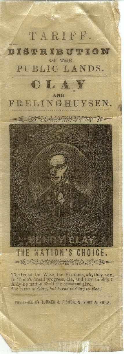 Thin cream-colored silk ribbon with image of Henry Clay in the center in a dark square. Large block letters above image read, "TARIFF / DISTRIBUTION OF THE / PUBLIC LANDS. / CLAY / AND / FRELINGHUYSEN. Finer print below image reads, "HENRY CLAY / THE NATION'S CHOICE. / The Great, the Wise the Virtuous, all, They say, / In Time's dread progress, die, and turn to clay! / A dying nation shall the comment give, / She turns to Clay, but turns to Clay to live!" / PUBLISHED BY TURNER & FISHER, N. YORK & PHILA."
