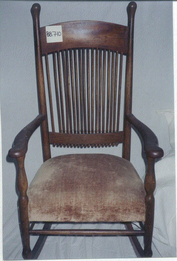 Oak rocker with brown velvet, spring-cushioned seat. The uprights on the back rise above the top rail to form bulbous knobs. There are 19 spindles on the back and 19 beads on underside of bottom rail. The 20th spindle is broken in half, but has been saved in a box of parts from other pieces of furniture that need to be repaired. Stretchers connect each leg of the chair. The right rocker has been replaced at some time with the current one made of a lighter wood.Dimensions
