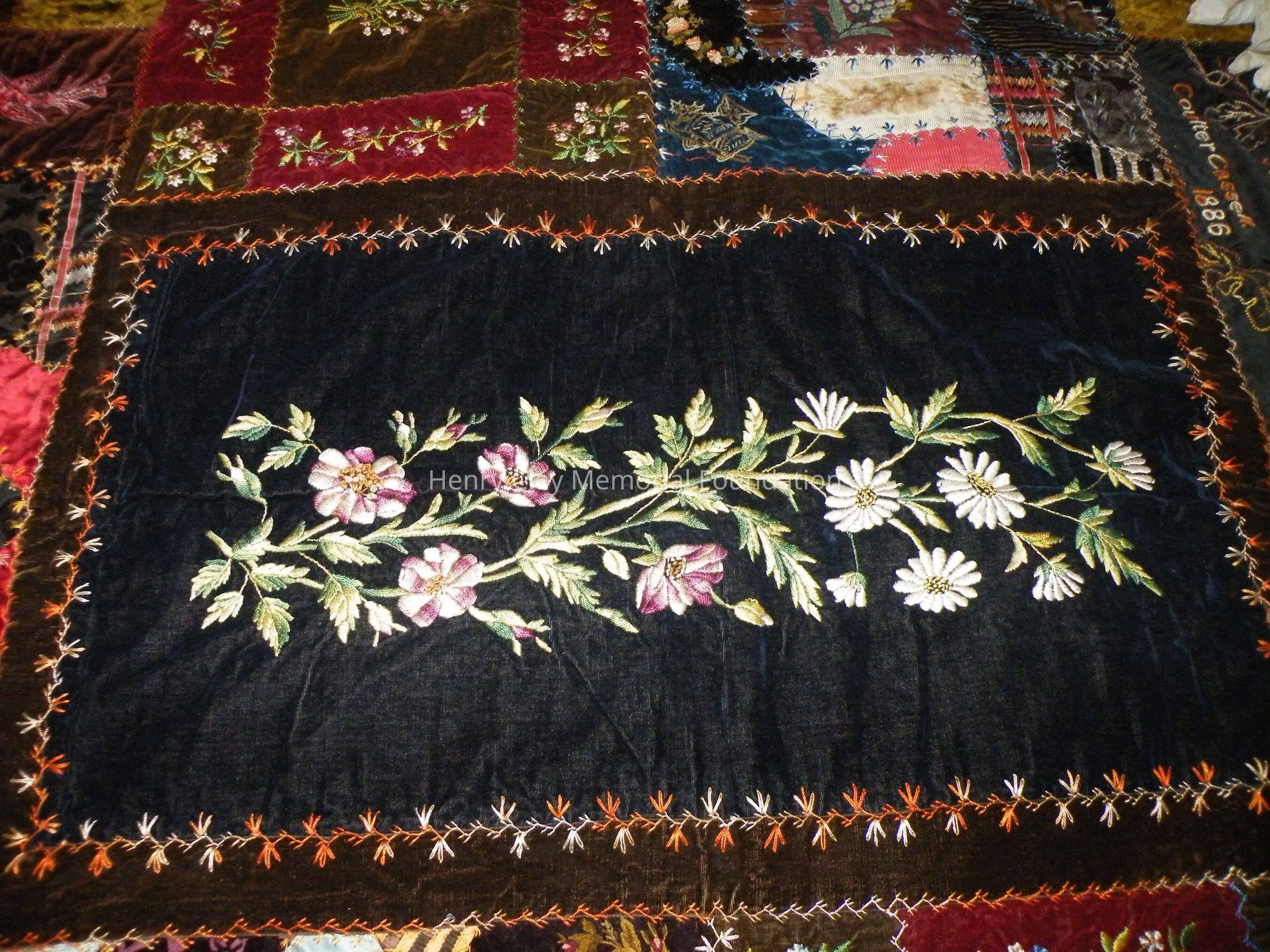 Dominantly velvet with some silk pieces, crazy quilt. Maroon velvet border with triangle yellow for design around the edge. Signed "Jennie Coulter Cassell.1886" near the top left of center. Four cotton strap ties at top edge (for display?). Maroon silk backing.