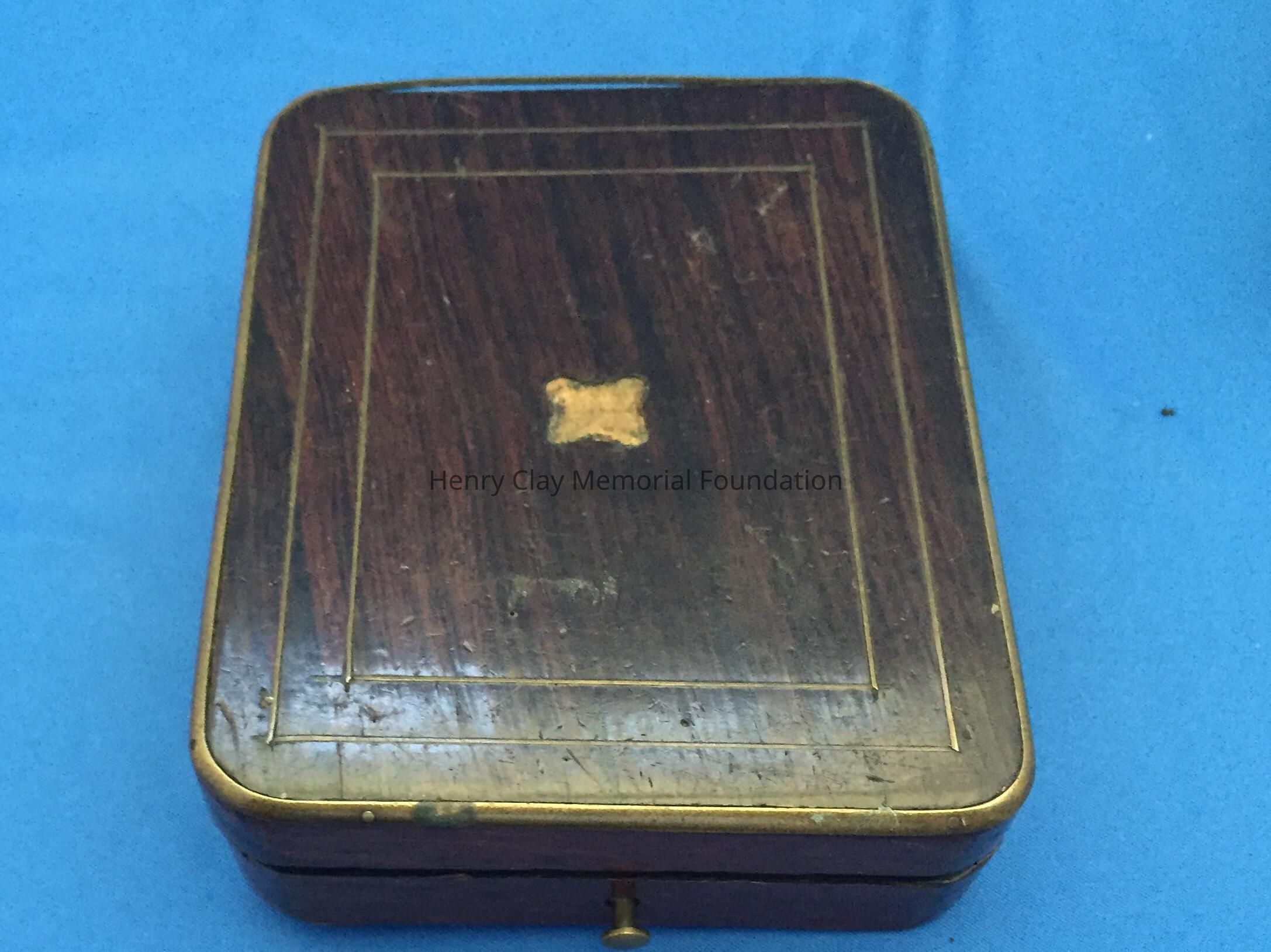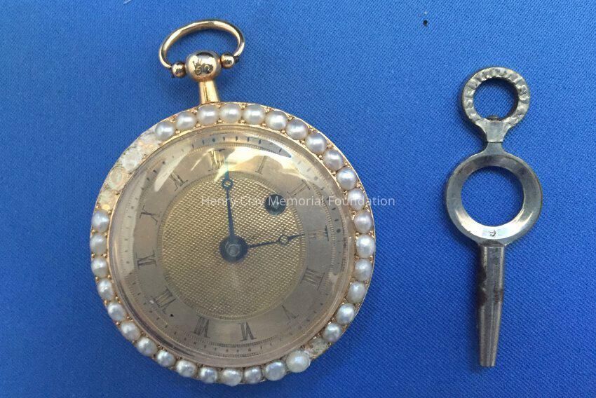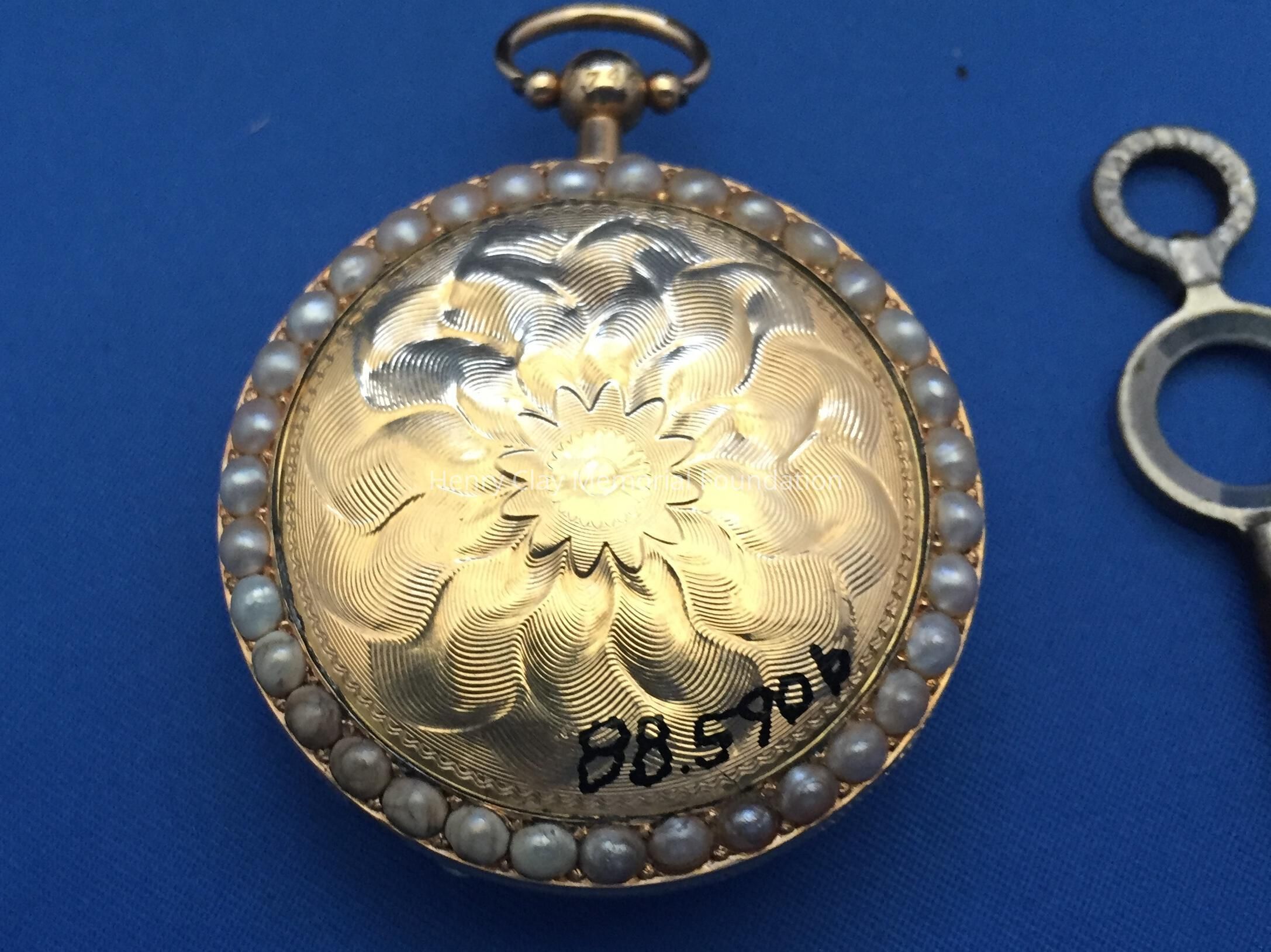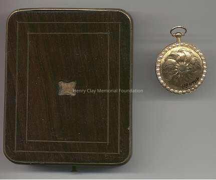 Contained in a dark wooden case with a hinged lid and lined with purple silk and velvet. Watch is gold with pearls (some missing) around the perimeter of face. On the back is a sun design. A manufacturer's card is included, "Frederic Nicoud/ Manufacturer of Chronometers and watches/ Chaux-De-Funds Switzerland/ I hereby certify that I have manufactured the watch No. 20964 Which I warrant the wear well and to be well regulated." Information taken from jewelry exhibit sponsered by Corbet-frame jewelers and HCMF: This man's pocket watch is a Fuzzee (Fusee Lever Movement). Completely made by "Tobias" in England. The watch has a chain driven movement... [ Rest of description similar to front of catalog sheet]. Two numbers stamped on stem: "50" and "9746". On clockworks: "Retap Avanc."Dimensions