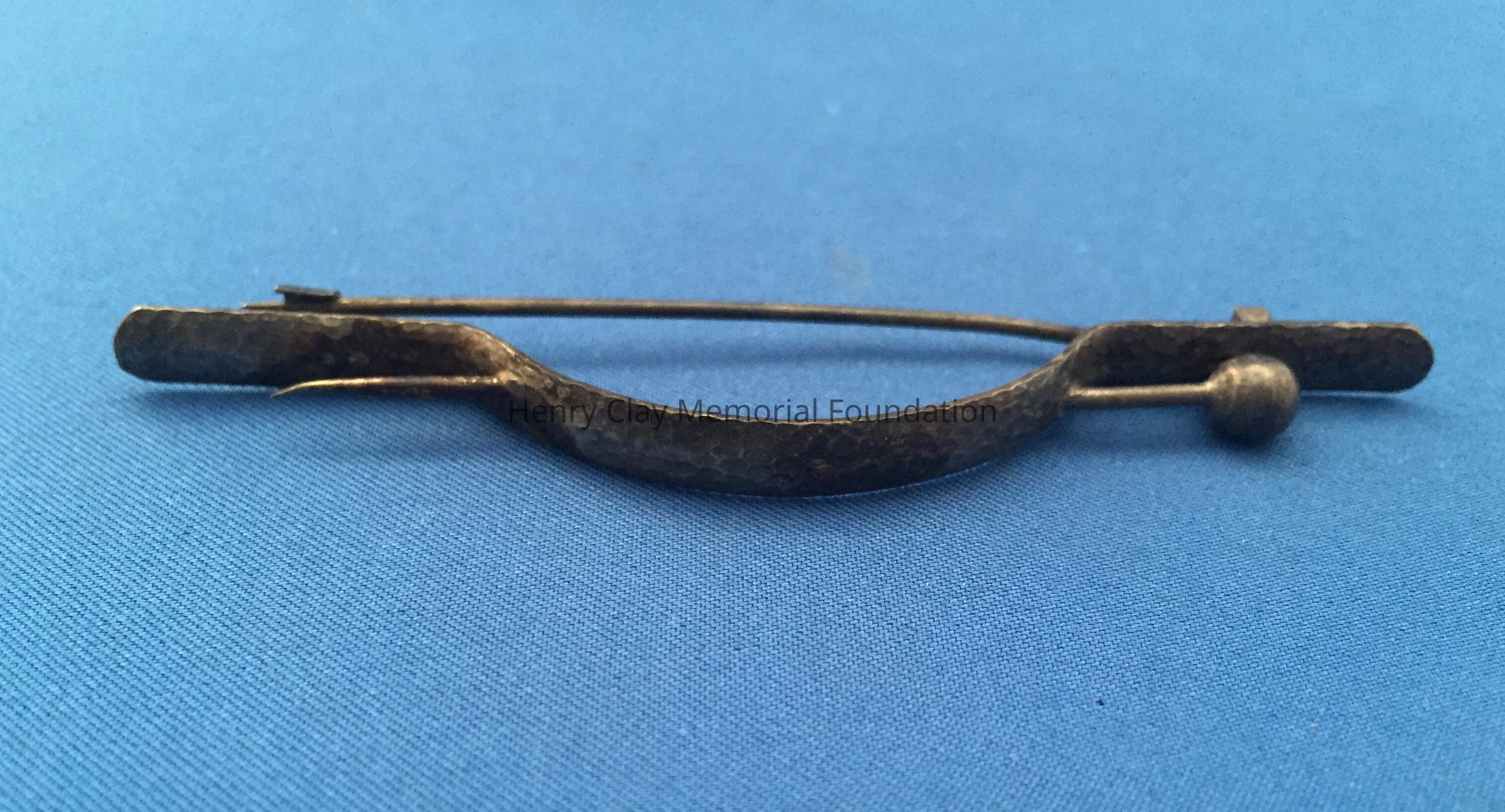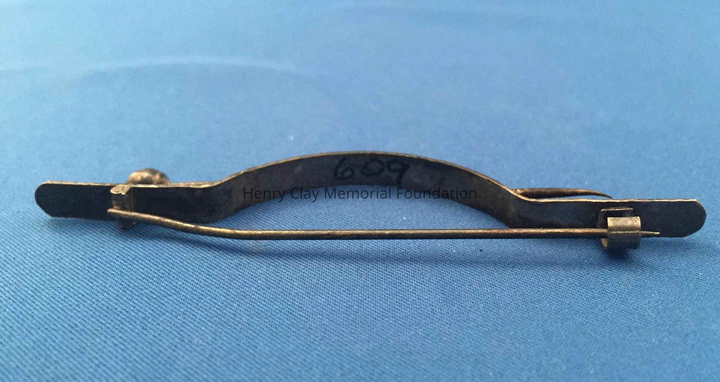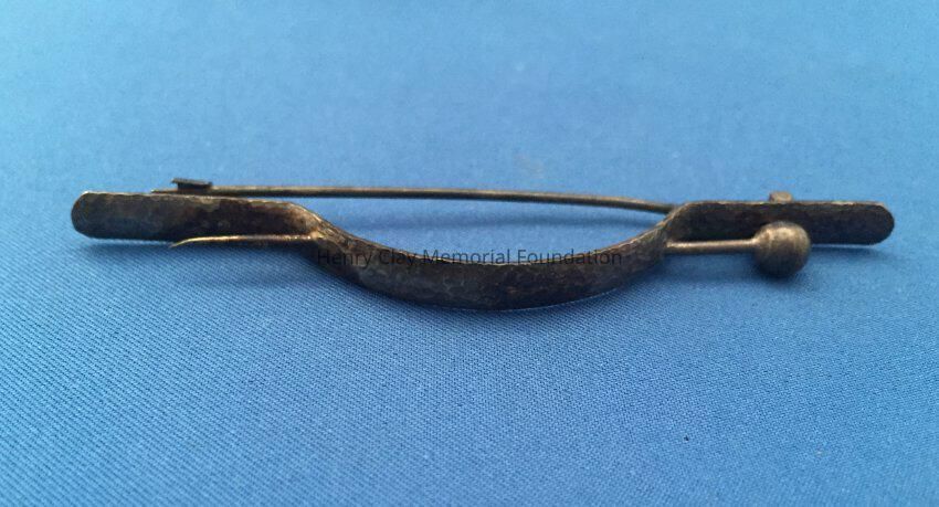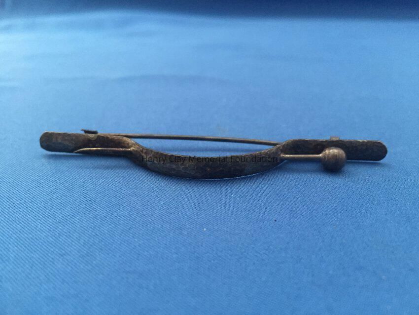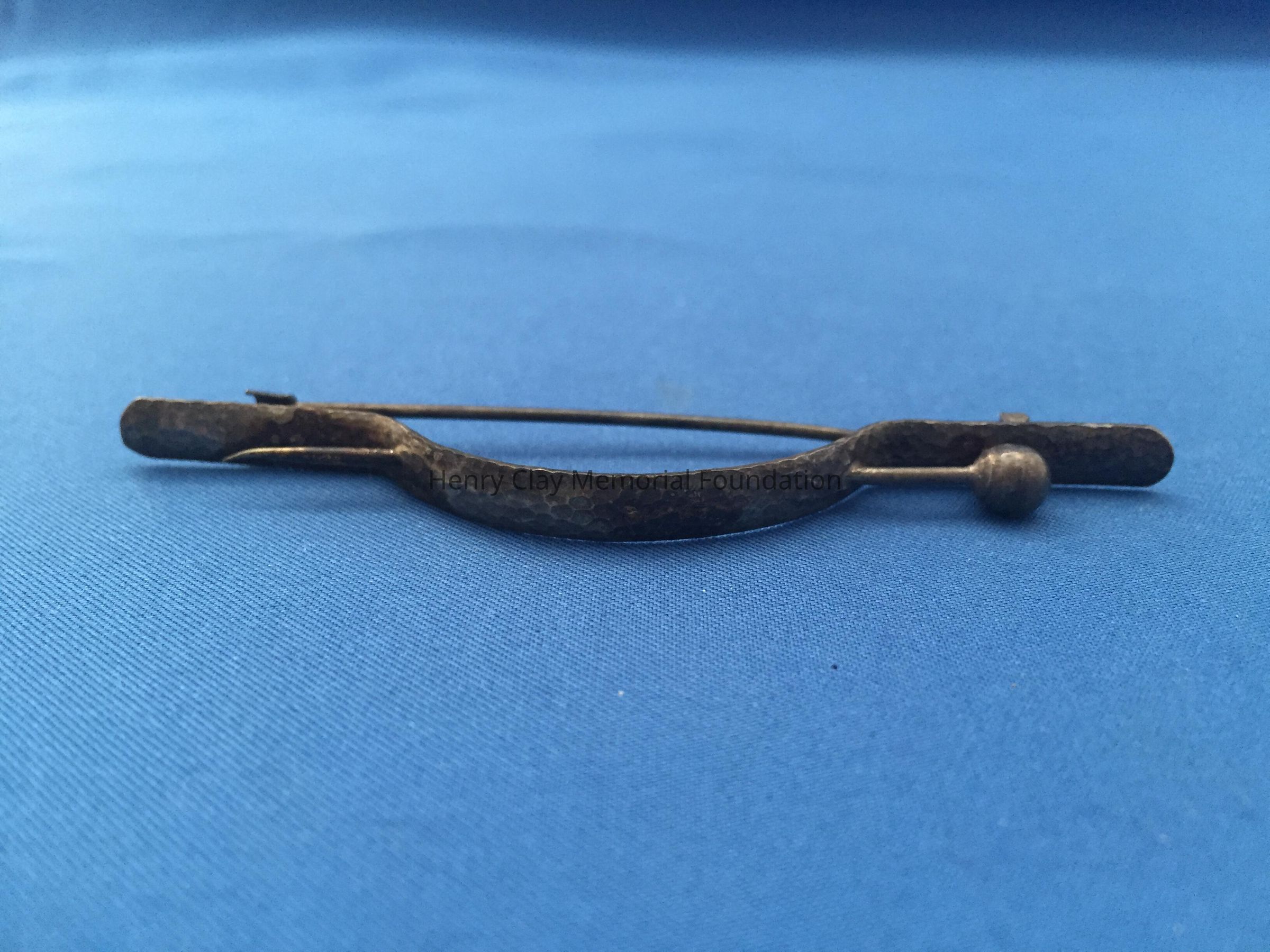 Silver metal flat bar, bowed in the center, with a fake bin sticking through either side of the bow. Crude pin clasp