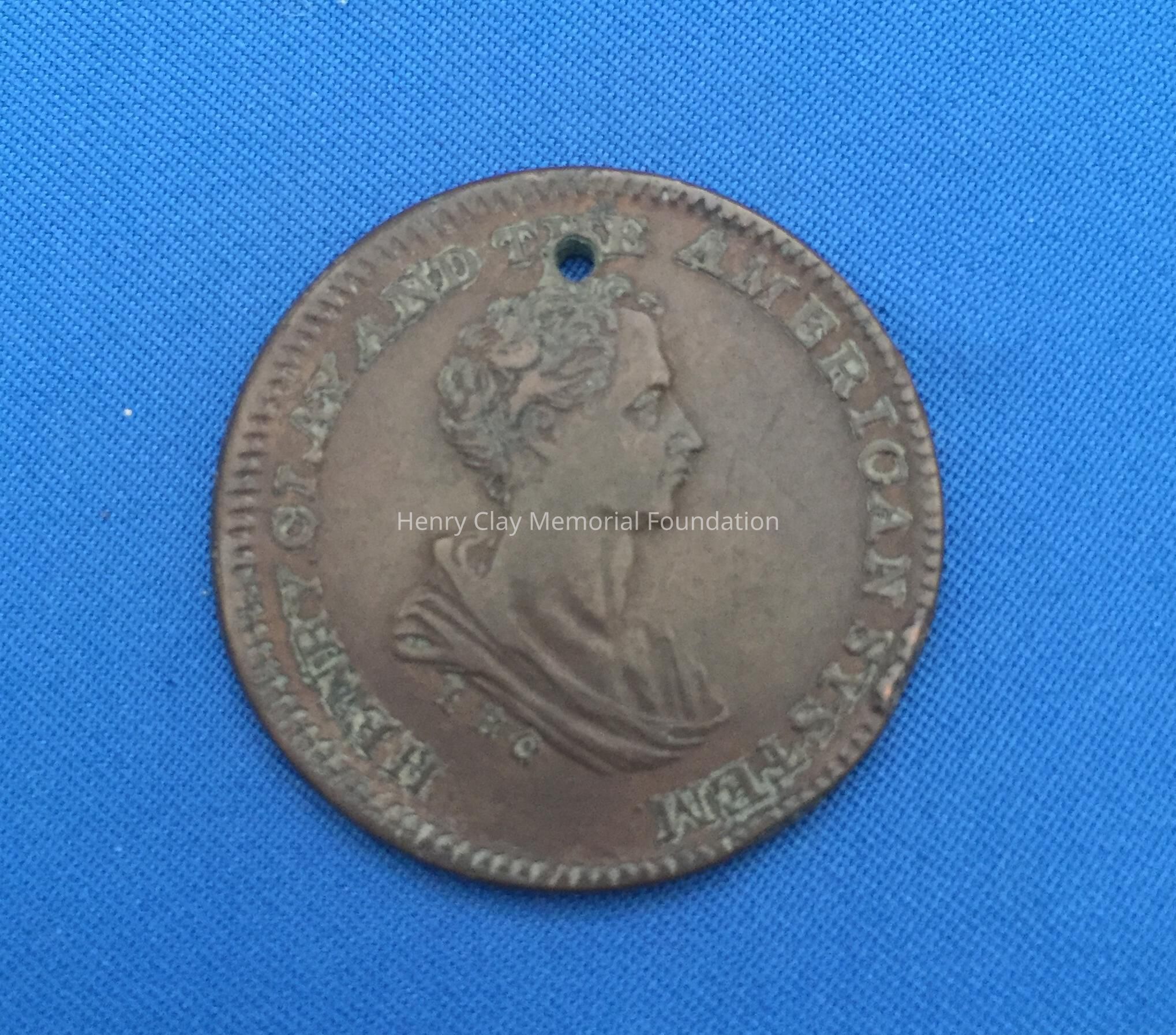 Coin with right profile of Clay (?). "IBC" below neck and "Henry Clay and the American System" around perimeter. On reverse, "United we stand" enclosed in wreath. Hole drilled through top.