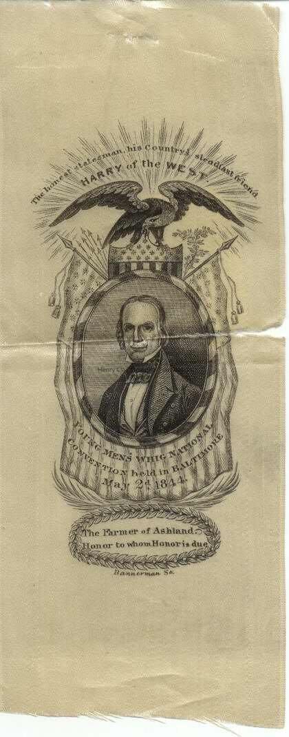 Cream-colored silk ribbon with printed image of Clay in center oval with flag draped around it. Oval is beneath an eagle holding a shield in its mouth with a starburst in the background. Above eagle: "The honest statesman, his Country's steadfast friend. / HARRY of the WEST." Beneath Clay: "YOUNGMEN'S WHIG NATIONAL / CONVENTION held in BALTIMORE / May 2d, 1844." Enclosed in a wreath beneath that: "The Farmer of Ashland. / Honor to Whom Honor is due." And the manufacturer's [?] name beneath that in fine print: "Bannerman So."