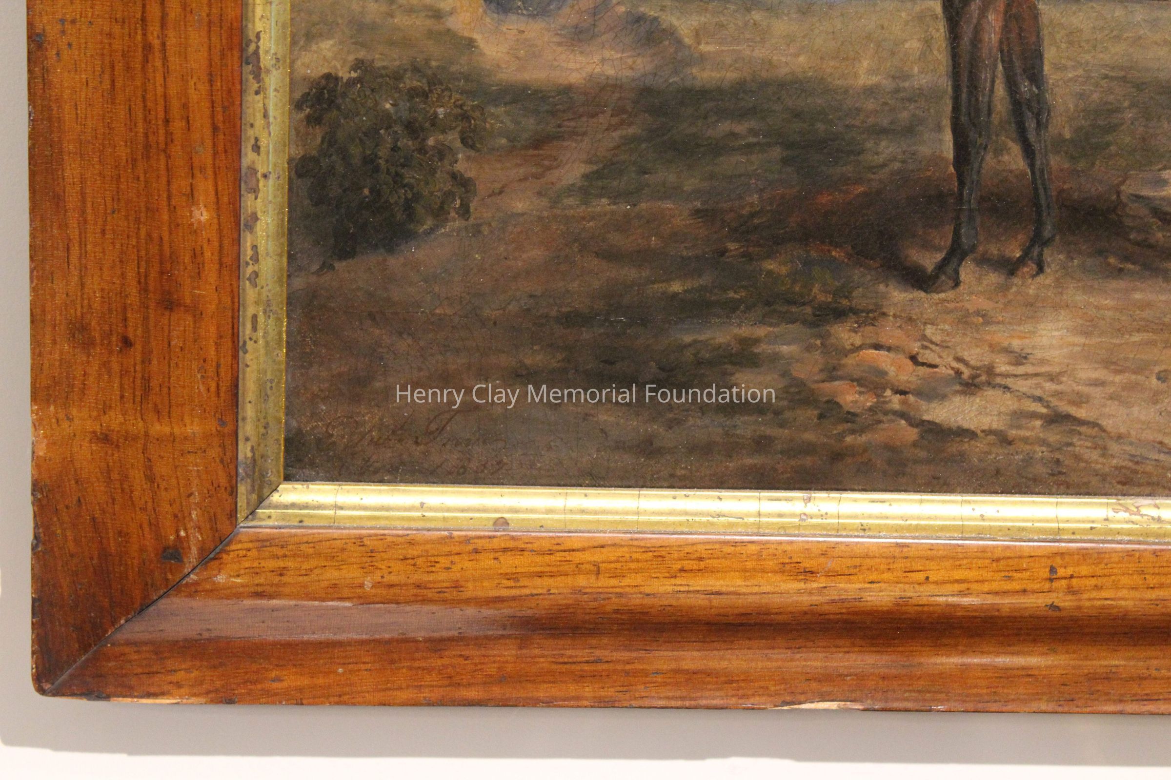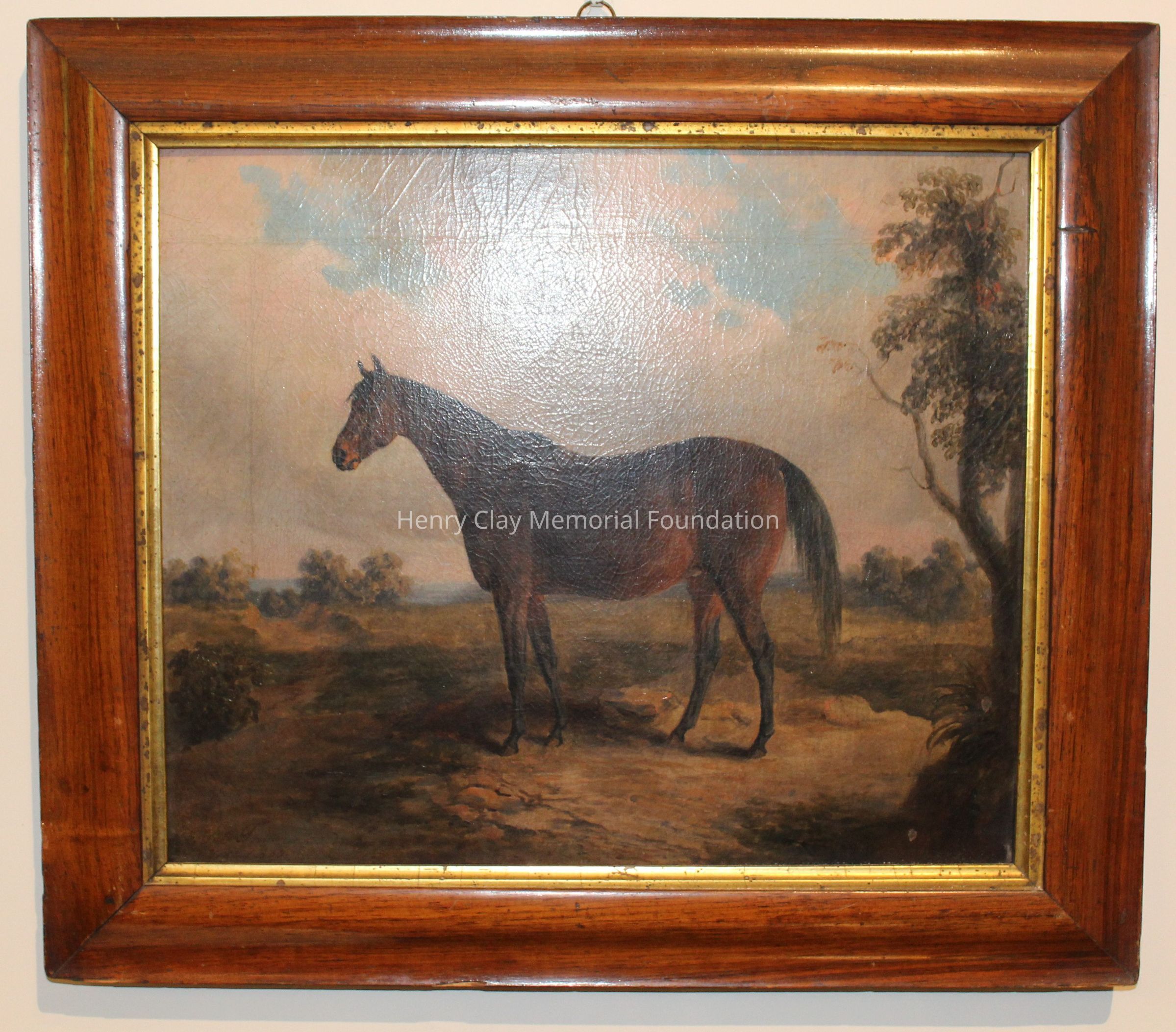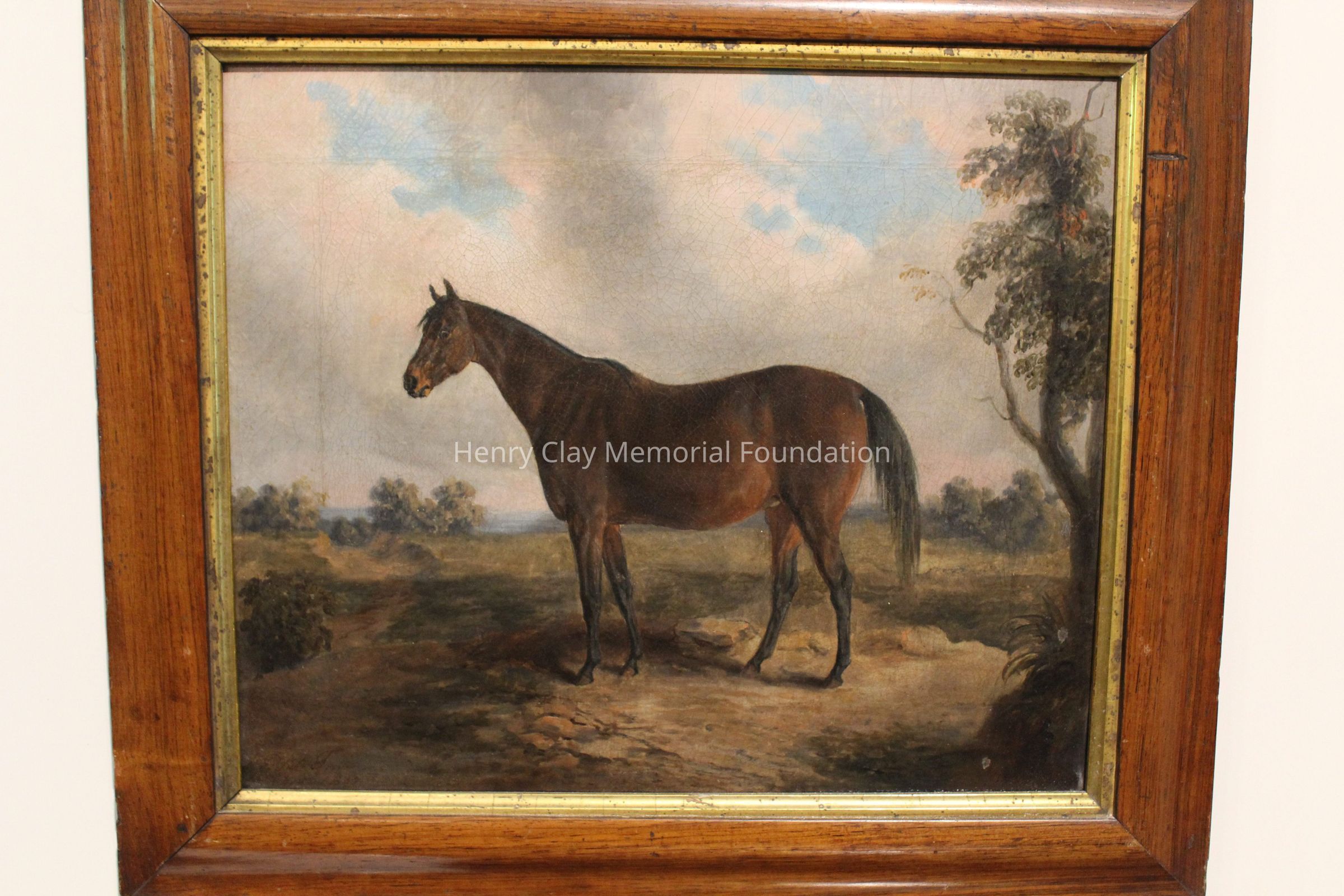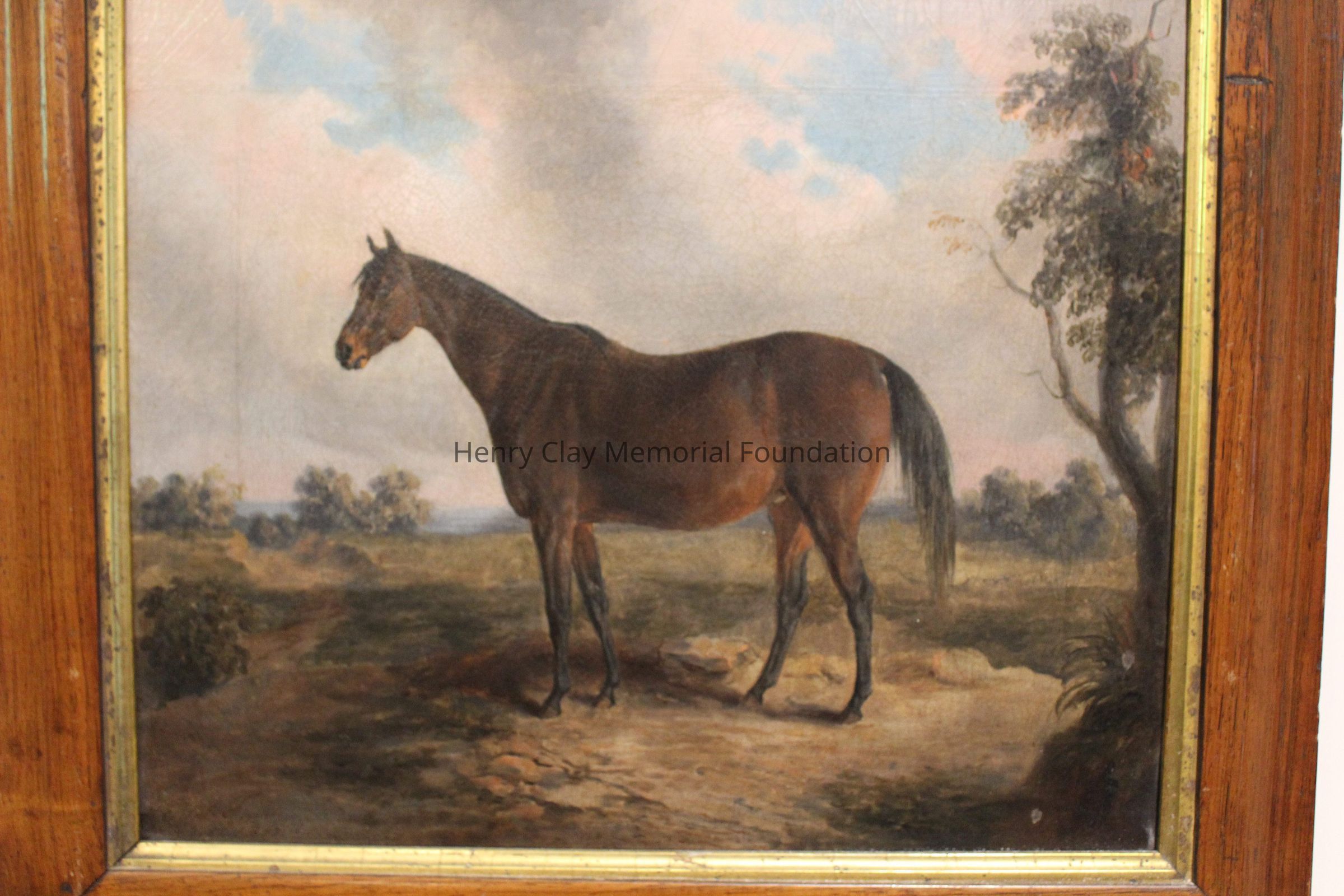 This painting is of a dark brown horse standing in a pasture. There is a larger tree to the right of the horse and smaller trees on the horizon line. The pasture has spotty grass, and the horse appears to be standing on dirt. The horse is facing left. The horse is dark brown with a black mane, tail and lower legs. Its muzzle is lighter in color. It is standing with the left front leg and right rear leg forward and the right front and left rear leg back. The sky is blue and has a great deal of white and grey cloud cover. The painting is framed in a natural reddish wood frame with gilt inner lip. It has a brass hanging ring at the top center.