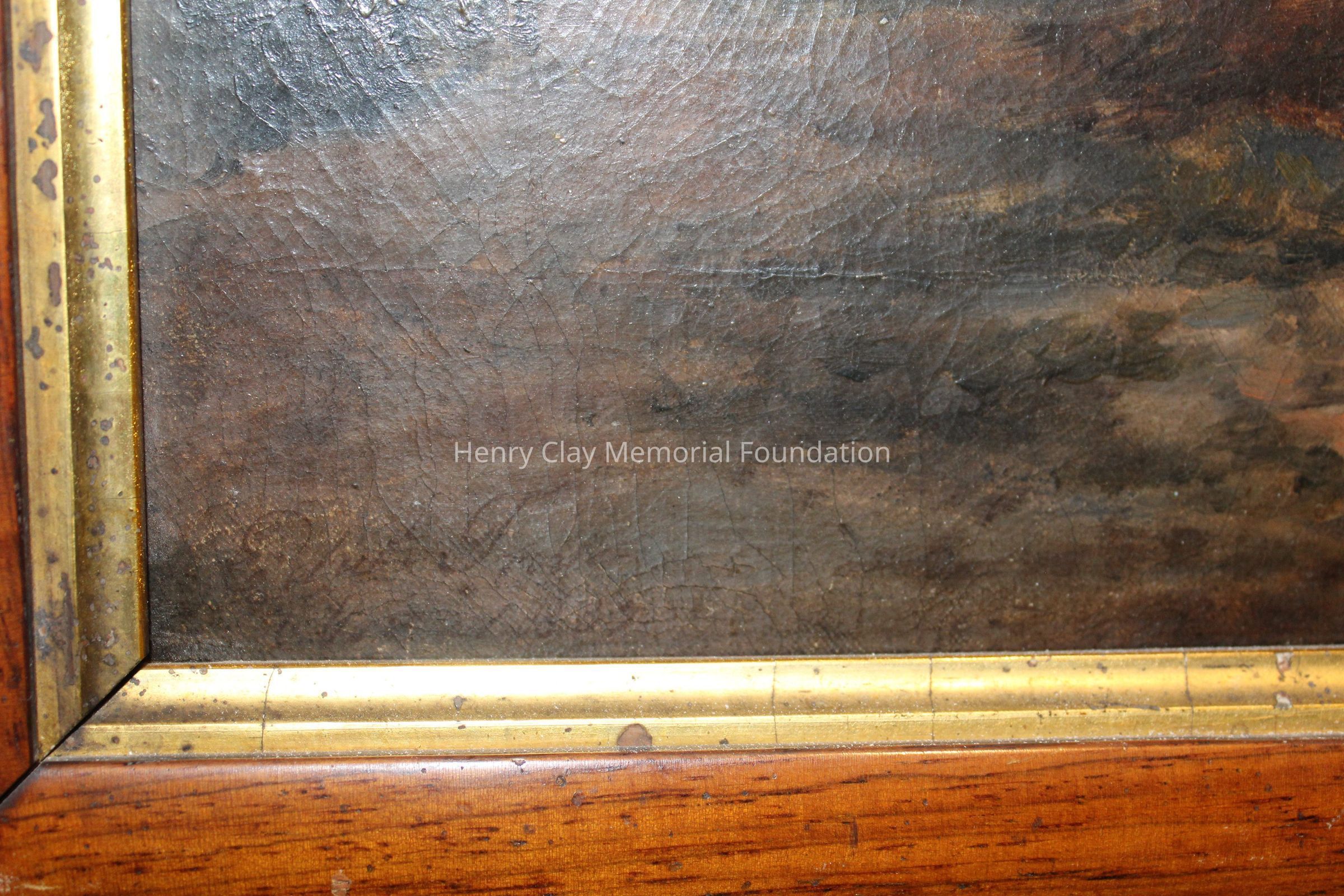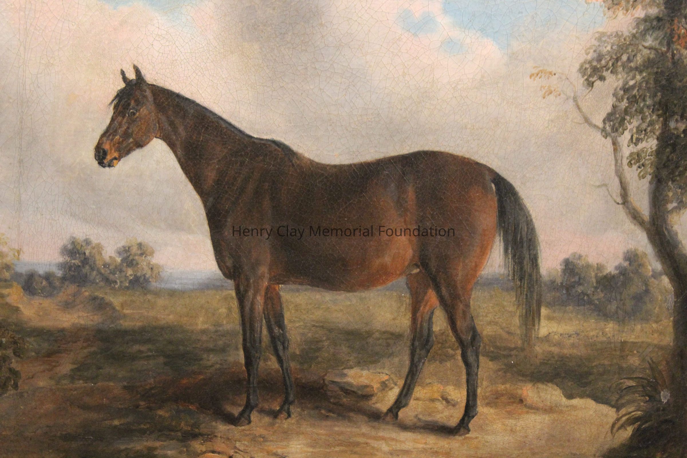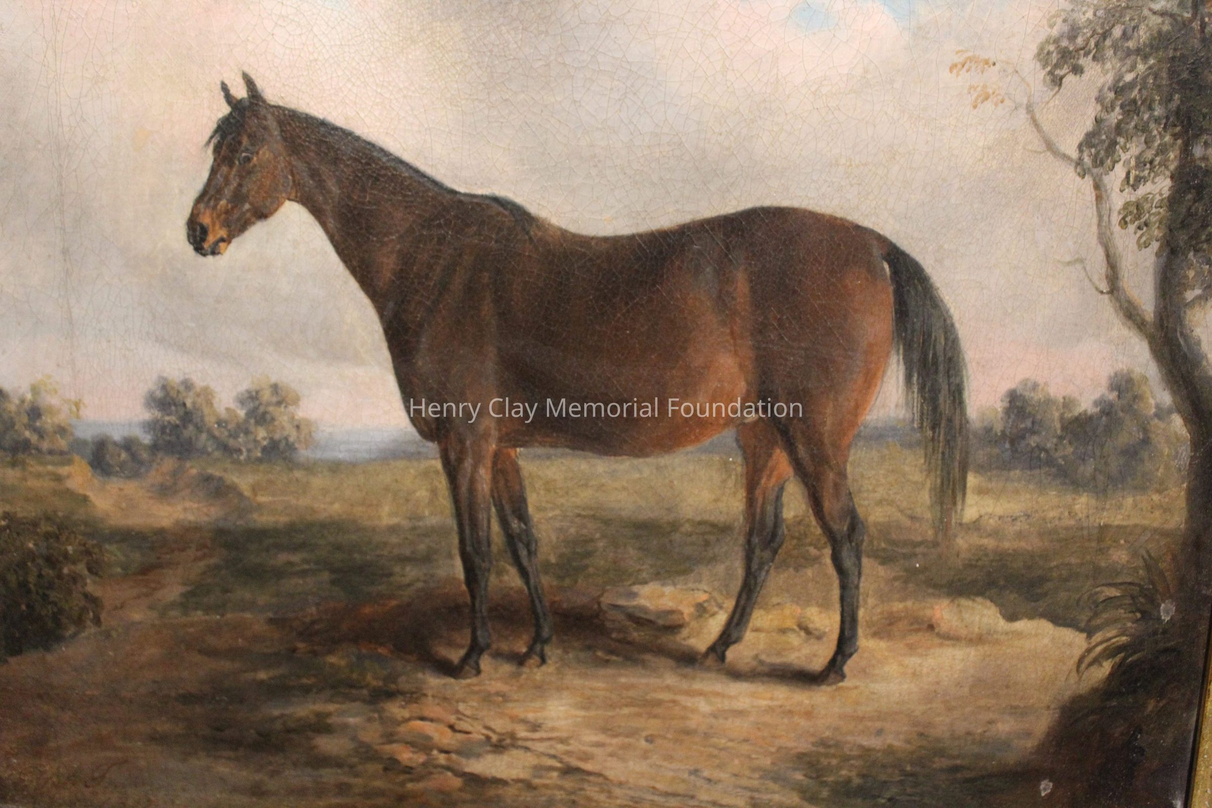 This painting is of a dark brown horse standing in a pasture. There is a larger tree to the right of the horse and smaller trees on the horizon line. The pasture has spotty grass, and the horse appears to be standing on dirt. The horse is facing left. The horse is dark brown with a black mane, tail and lower legs. Its muzzle is lighter in color. It is standing with the left front leg and right rear leg forward and the right front and left rear leg back. The sky is blue and has a great deal of white and grey cloud cover. The painting is framed in a natural reddish wood frame with gilt inner lip. It has a brass hanging ring at the top center.