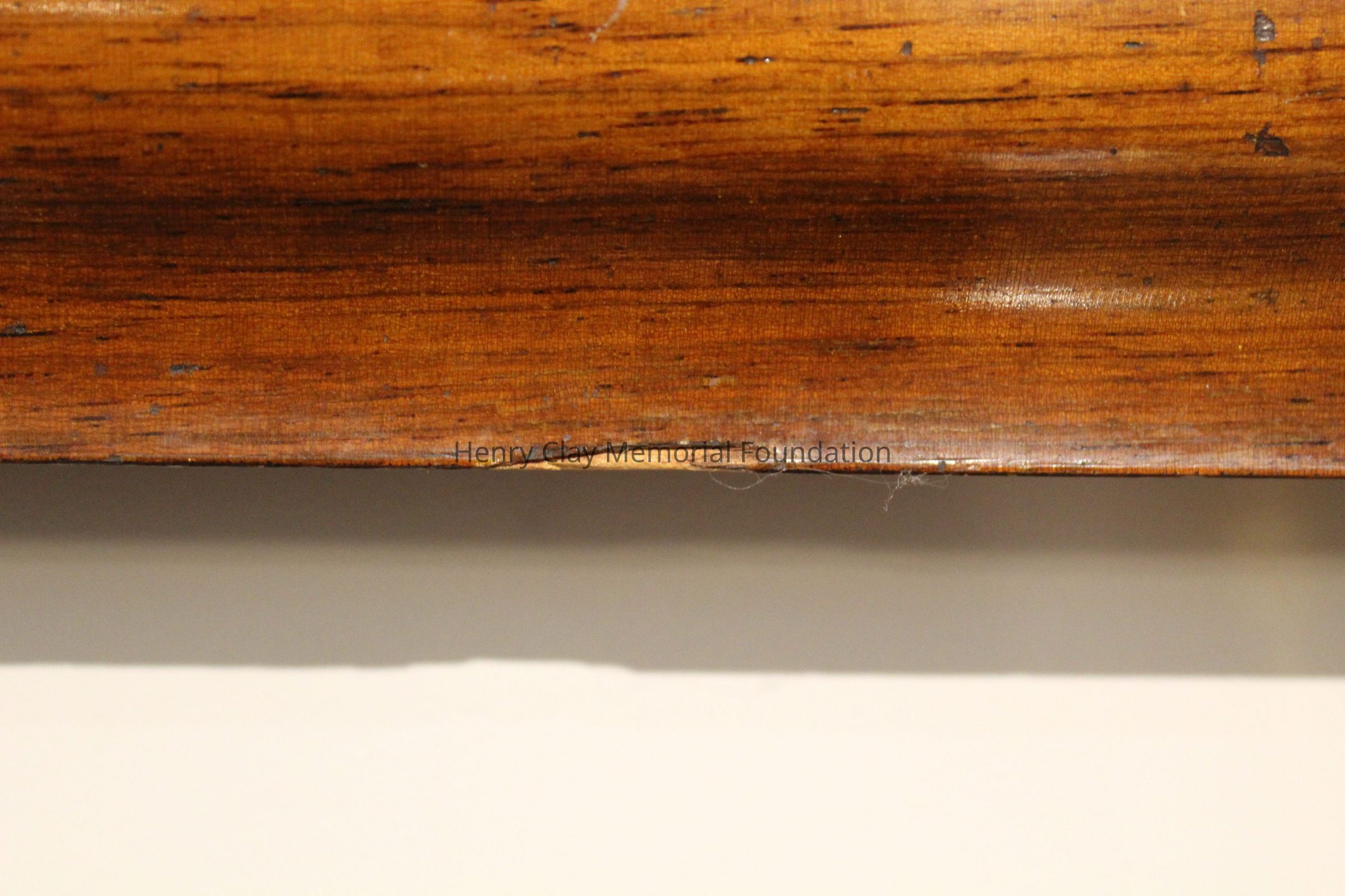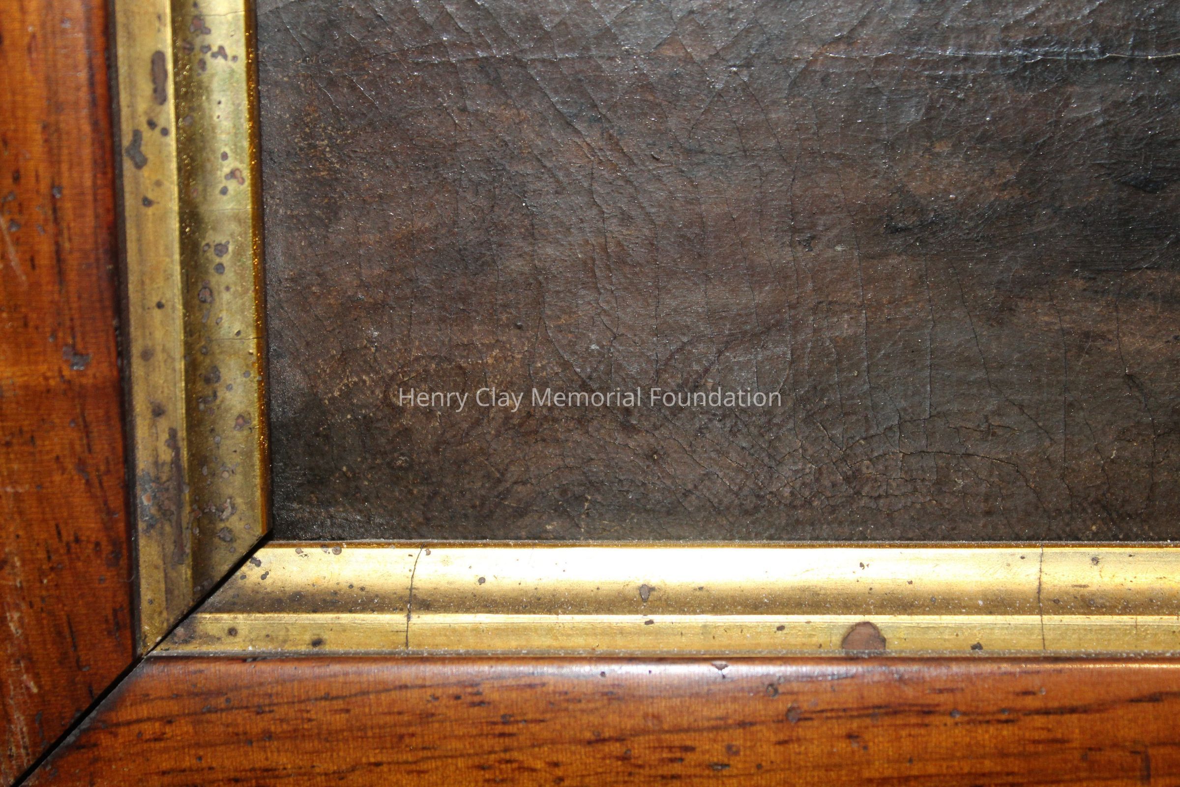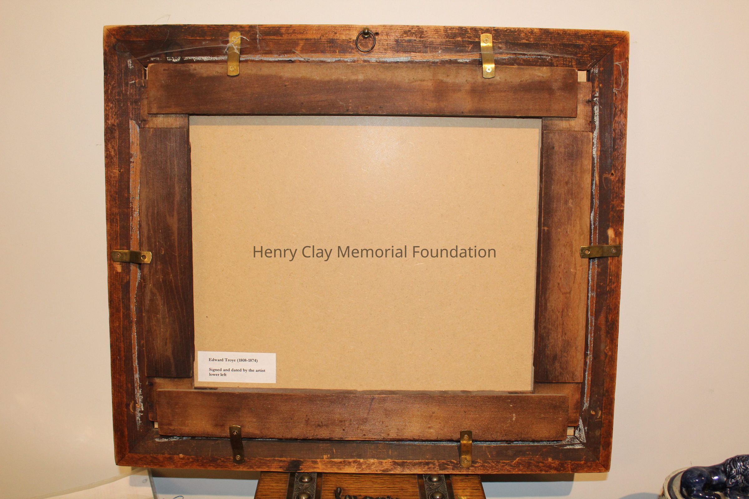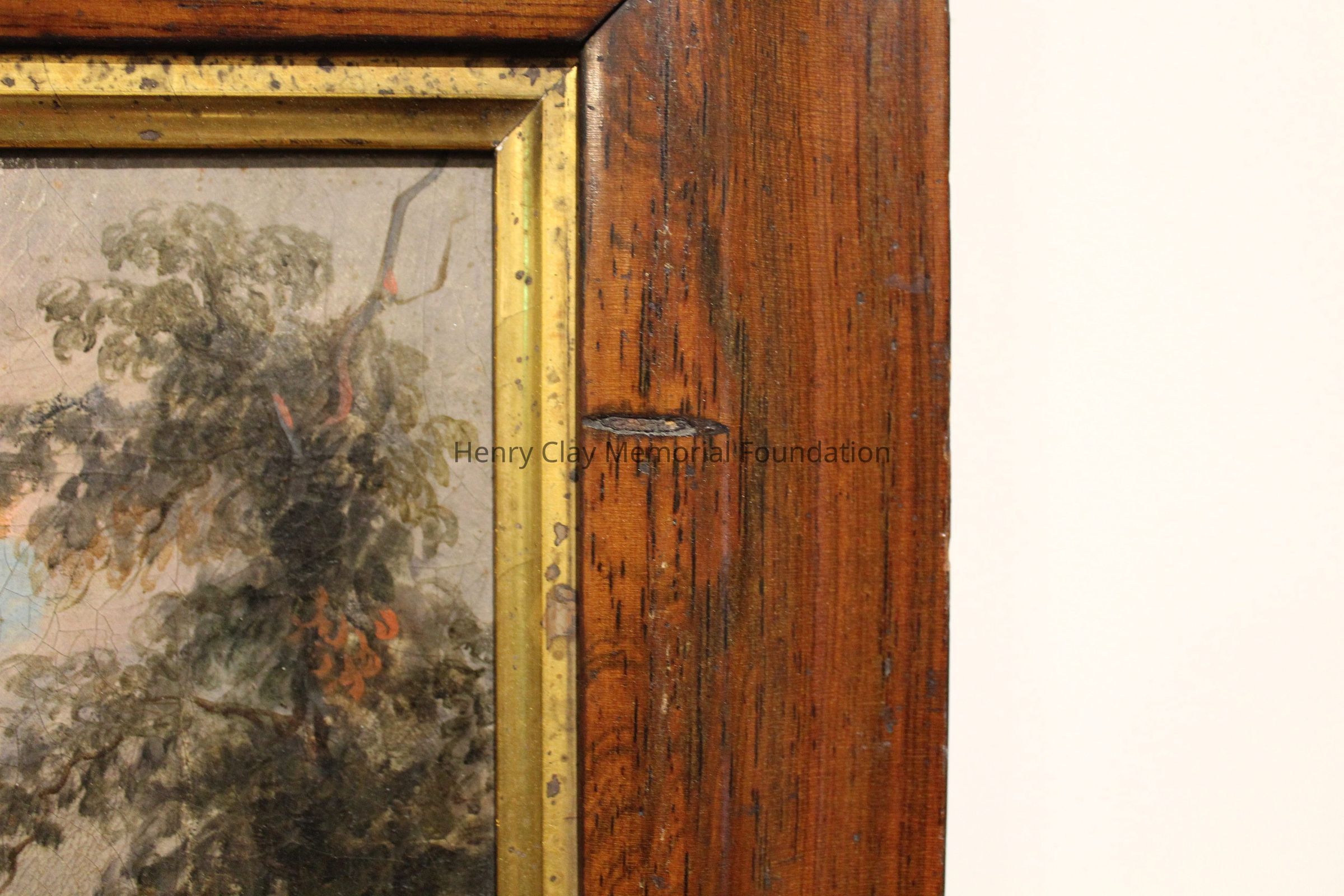 This painting is of a dark brown horse standing in a pasture. There is a larger tree to the right of the horse and smaller trees on the horizon line. The pasture has spotty grass, and the horse appears to be standing on dirt. The horse is facing left. The horse is dark brown with a black mane, tail and lower legs. Its muzzle is lighter in color. It is standing with the left front leg and right rear leg forward and the right front and left rear leg back. The sky is blue and has a great deal of white and grey cloud cover. The painting is framed in a natural reddish wood frame with gilt inner lip. It has a brass hanging ring at the top center.