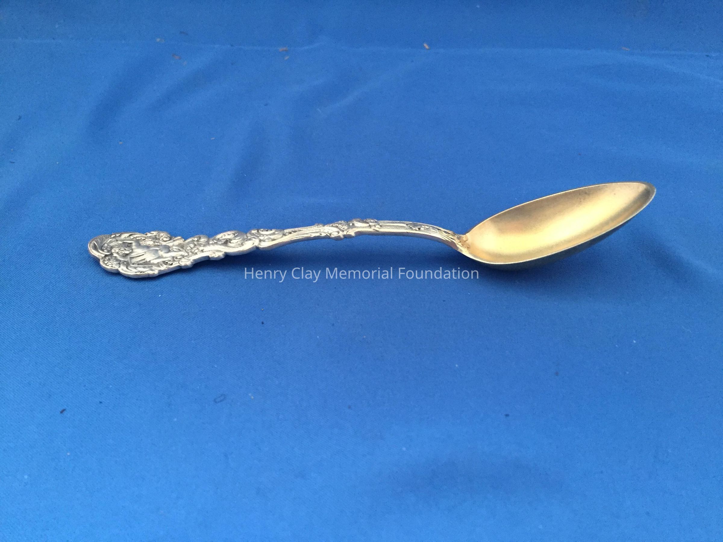 12 sterling with deep, long gold-wash bowls. Decorative handles, wach with an angel playing a lyre at top. Back of bowl has makers mark over "Sterling" over "Copyrighted"