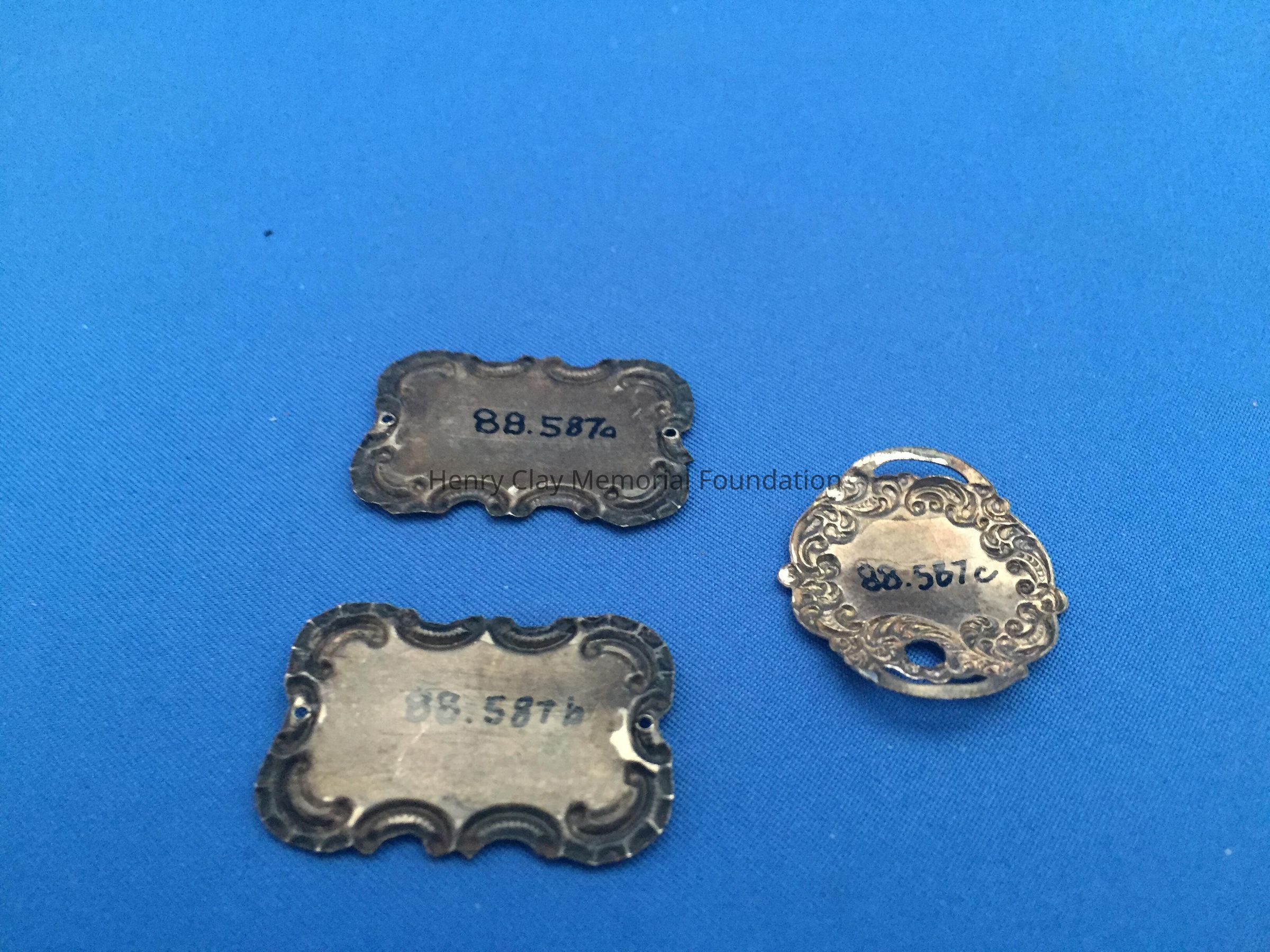 Three silver tags (for luggage, canes?). A & B are identical: rectangular with "McD" and C is round, convex, with initial "B" in center.Dimensions