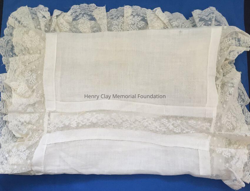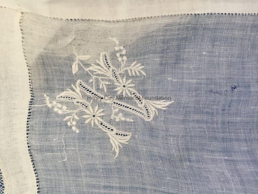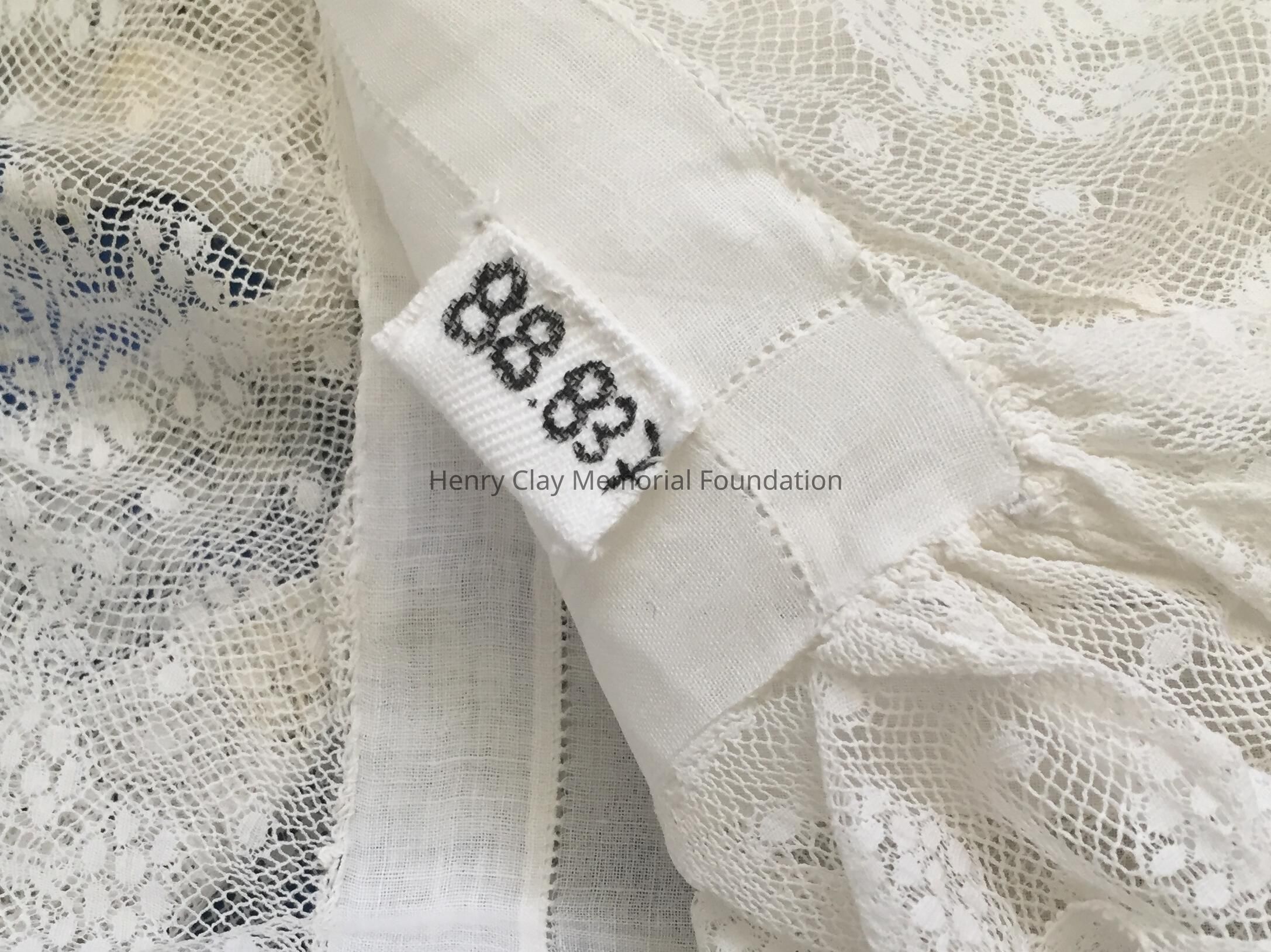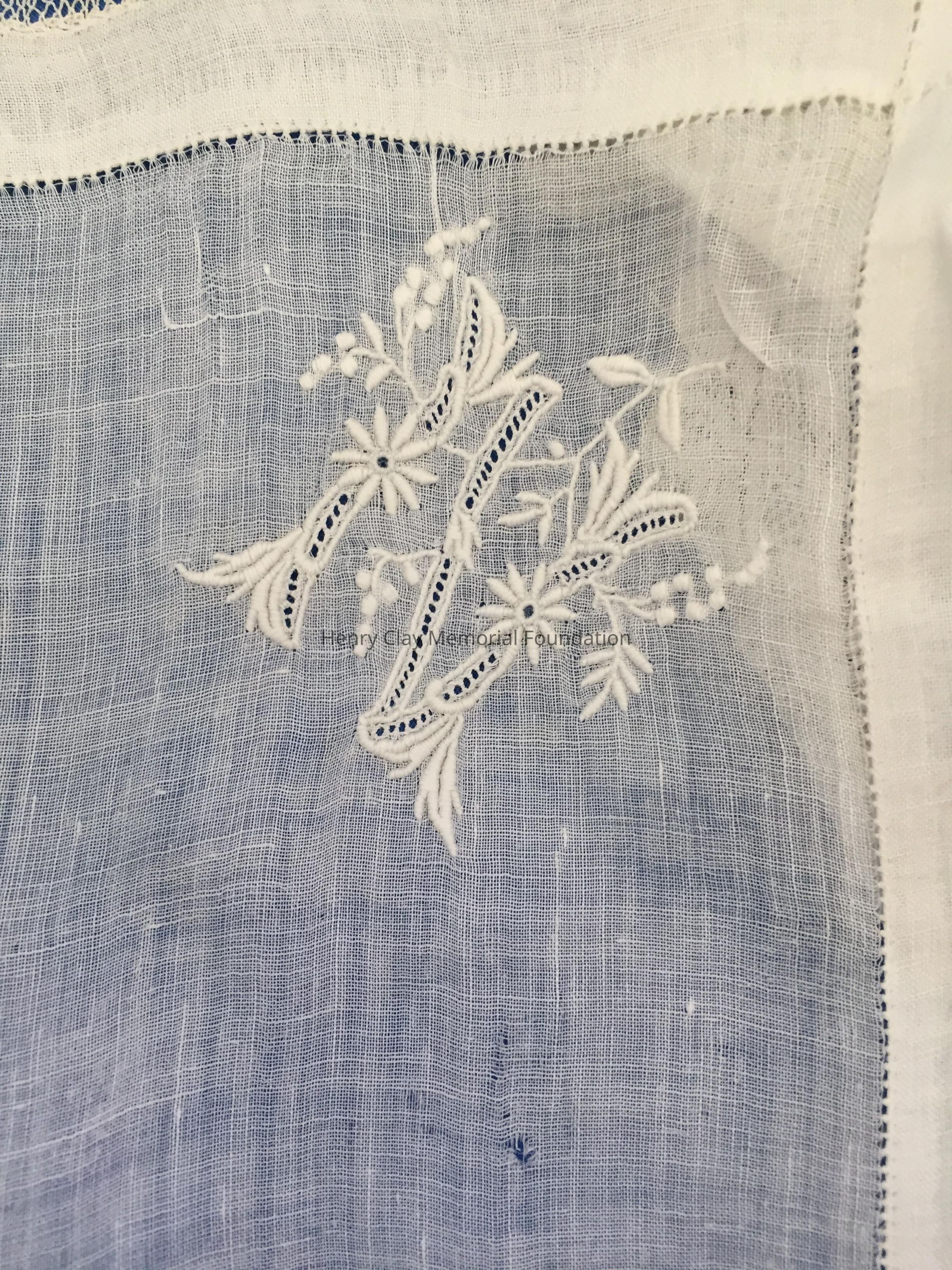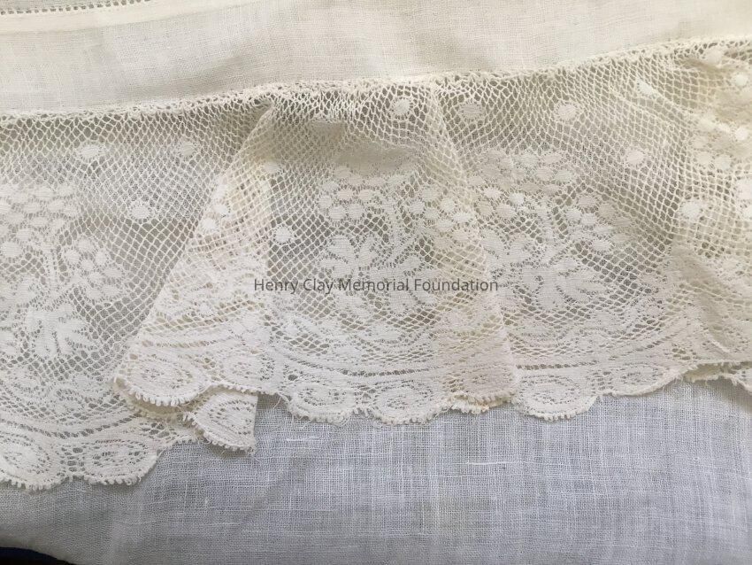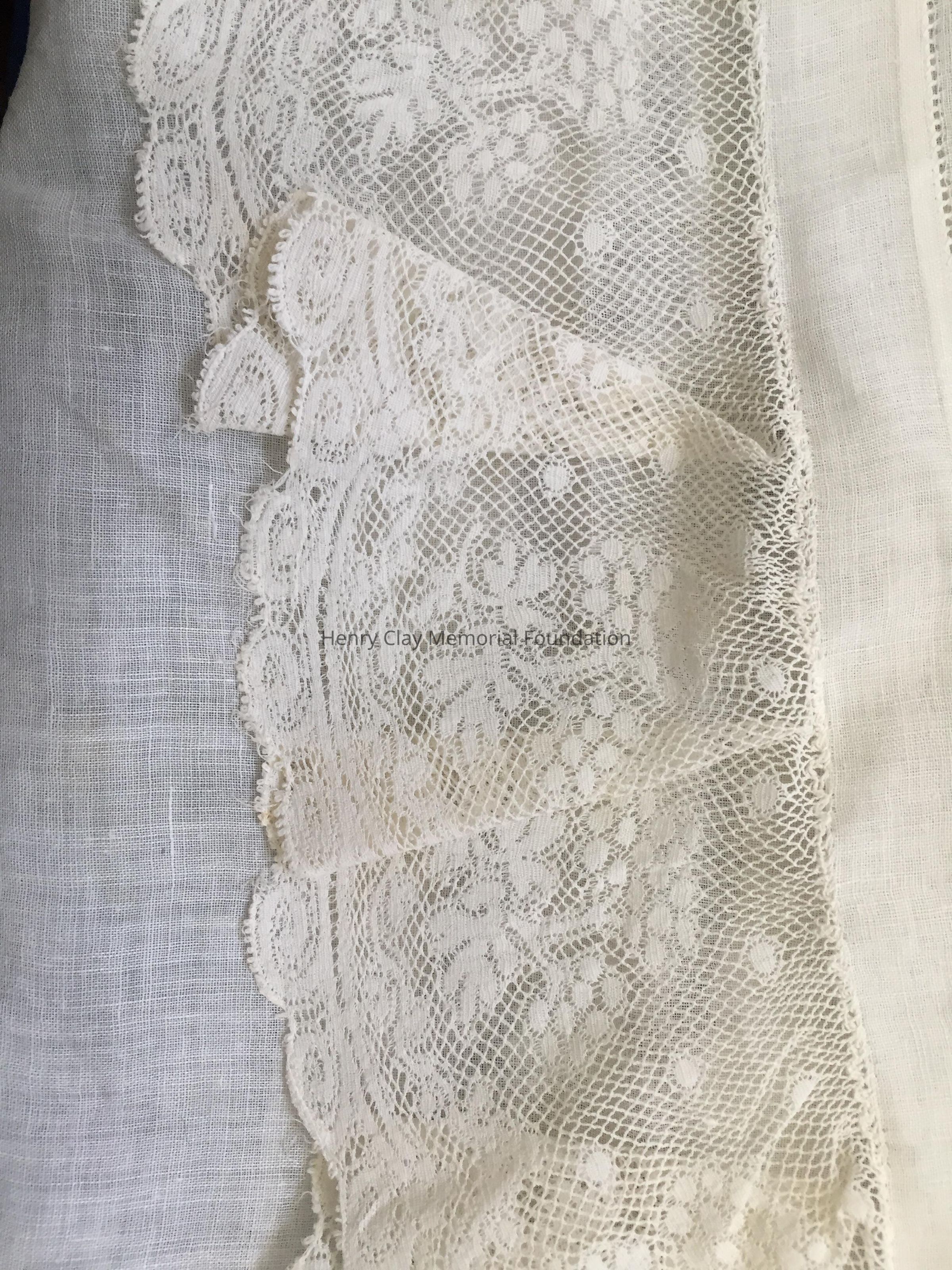 A three panel linen dress scarf. 1.5 in lace border between each panel. Surrounding all linen panels is a lace ruffled edge (2 3/4). On each panel is a "N" embroidered in a corner. In each panel, decorative stich outline the panel and give it a border.