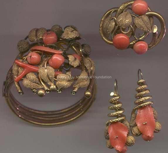 Matching gold and coral set includes: A) Bracelet, B) Brooch, C&D) pair of earrings.Dimensions