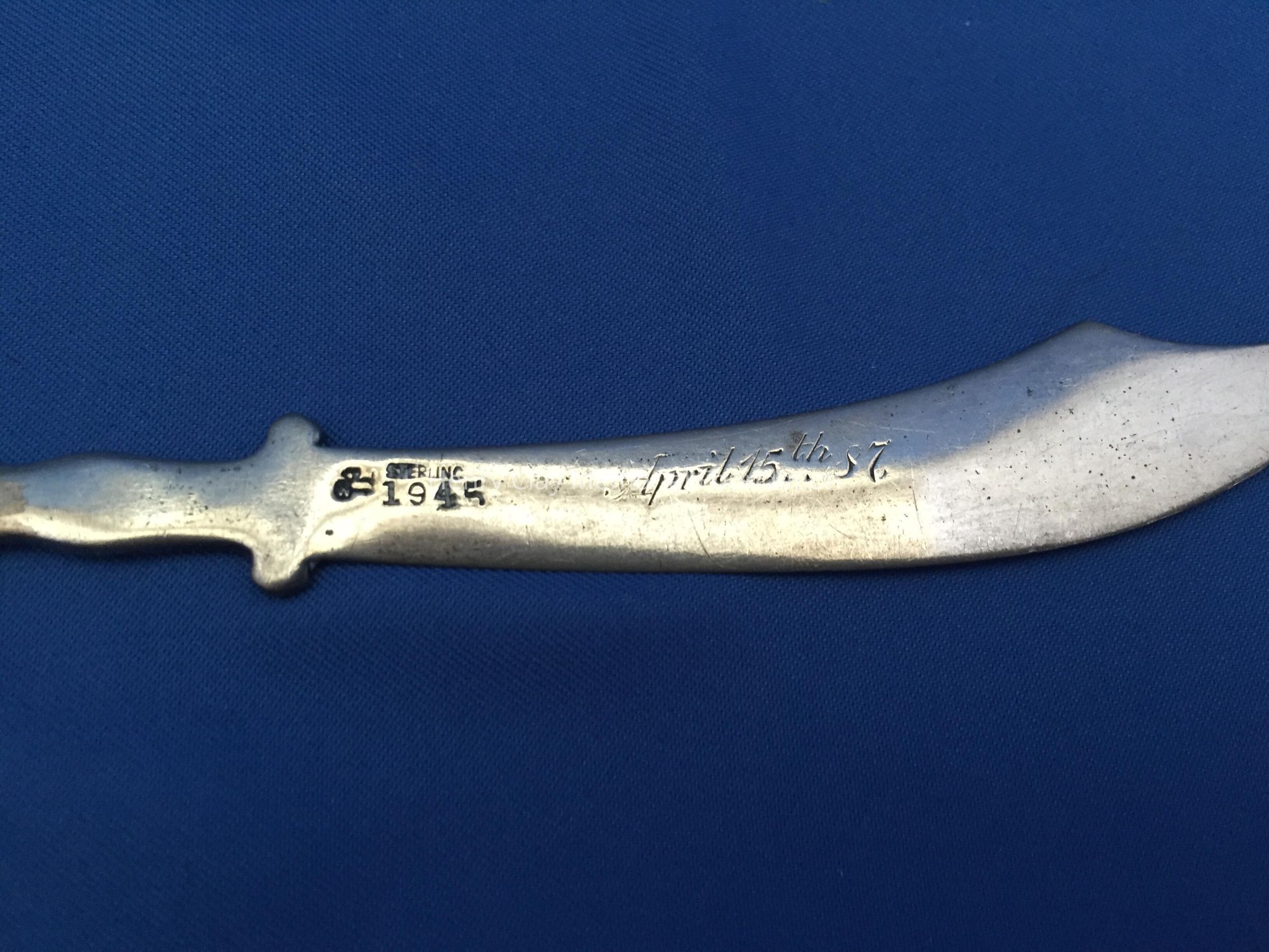Sterling silver letter opener in the shape of a scimitar [sword]. Handle is decorated with flower buds. One side of blade engraved, "Mrs. McDowell"; the opposite side with, "April 15th 87" and a silver mark.Dimensions