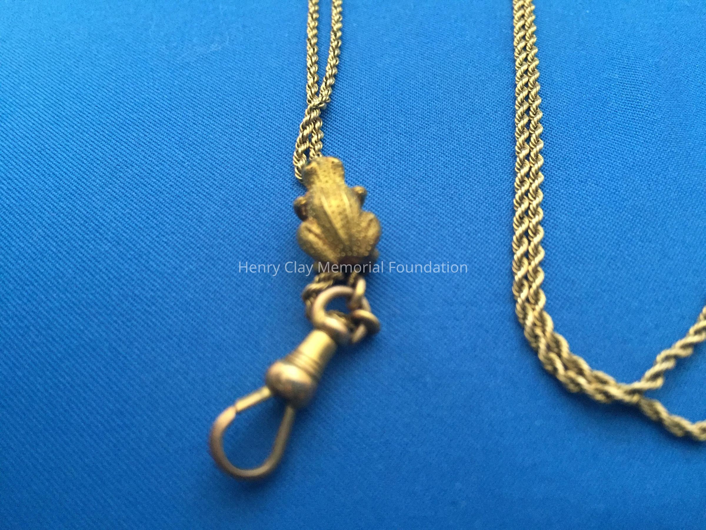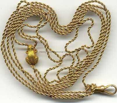 18k 49.5" gold chain with small ornamental frog slide with green eyes.