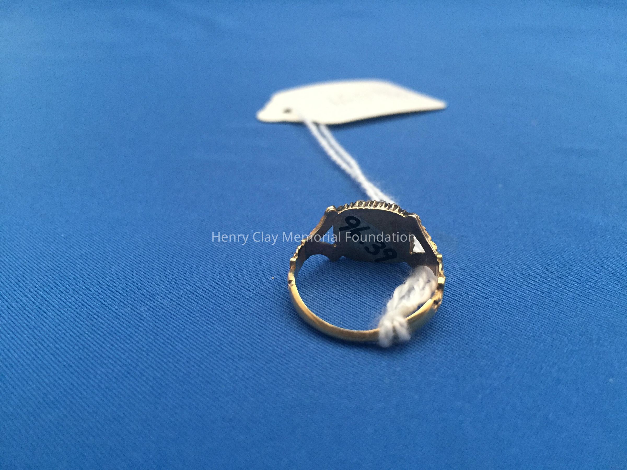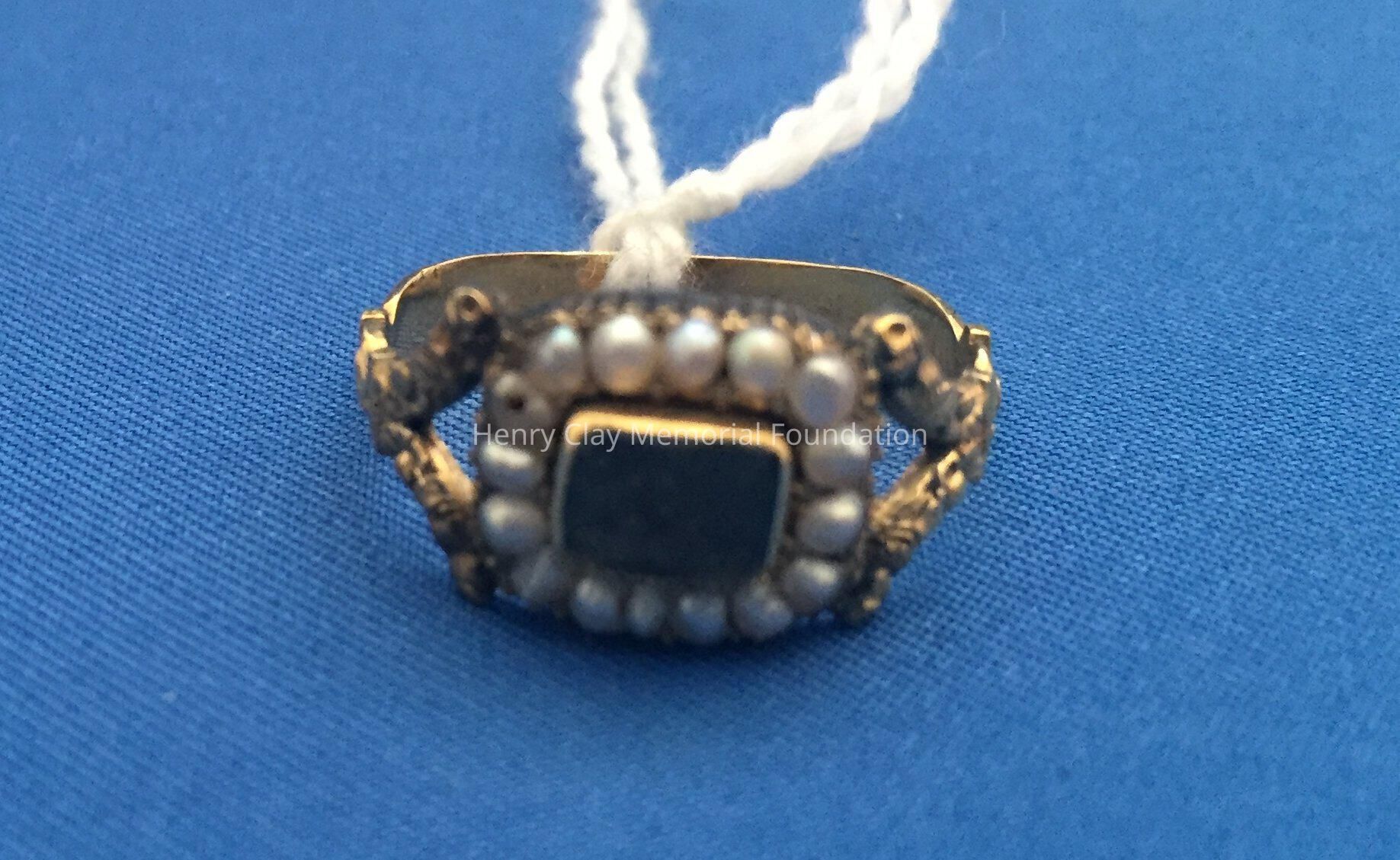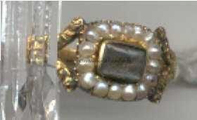 Gold ring with small centerpeice containing a lock of hair enclosed in a ring of 16 seed pearls.